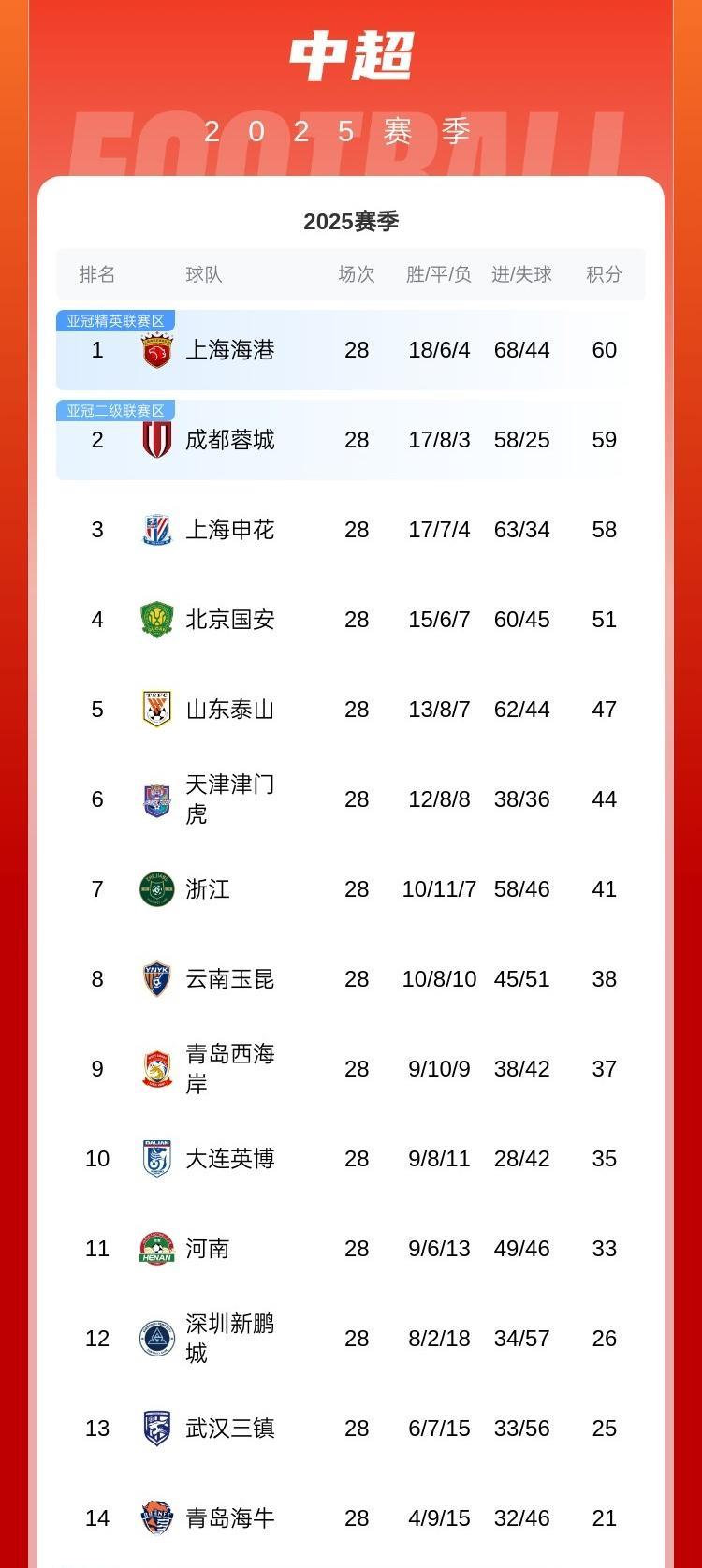 本轮最佳、山东球队 随着上海申花2-2绝平大连英博,中超第28轮的比赛全部结束,积分榜前四集体翻车,两平两负一胜难求,其中第一、第二、第四皆是被山东球队阻挡,来看下具体赛果和排名! 首先是榜首的上海海港,做客迎战老对手山东泰山,先进一球的情况下连丢三球1-3败北,卡扎梅开二度以24粒进球领跑射手榜,其次排名次席的成都蓉城客场2-2读秒绝平青岛西海岸,错失登顶良机,排名第四的北京国安主场2-4被青岛海牛逆转,国安自从0-6惨败泰山之后,五场联赛一胜四负,半程冠军早早退出争冠,令人唏嘘! 最后出场的上海申花,凭借补时的点球主场2-2战平大连英博,依然落后海港两分,目前前三名分差只有两分,在还剩两轮的情况下谁都有可能拿下最后的冠军! 保级方面海牛赢球暂时脱离降级区,但和长春亚泰、梅州客家之间的差距并不大,还是变数挺大的!