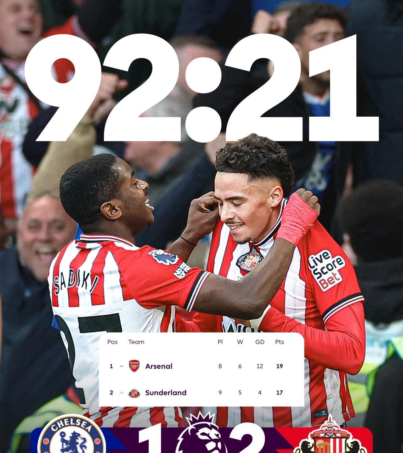 既是黑猫、又是黑马 英超第九轮,切尔西坐镇斯坦福桥迎战升班马桑德兰,加纳乔闪击破门、伊西多扳平比分,塔尔比补时绝杀帮助桑德兰从客场带走三分,此战过后升班马升至积分榜第二! 本场2-1不仅是桑德兰时隔十一年再次在客场击败切尔西,更以9轮17分创造了队史英超同期的积分记录,9轮过后排名积分榜第二,更是时隔24年再次做到,9场联赛收获5场胜利,黑猫已经比上赛季降级的伊镇、圣徒一整个赛季赢得还要多,桑德兰看来不想一个赛季就回英冠! 今年夏窗,黑猫豪掷2亿欧元引进了多名低调有实力的悍将,首发阵容大变样,击败的对手包括蓝军、狼队、森林、小蜜蜂、铁锤帮,战平水晶宫以及维拉,实力不容小觑,赛后黑猫主帅雷吉斯-勒布里斯接受采访时表示,他们的目标是尽快拿到40分保级基准线,按照他们9轮拿下17分这个效率,目标并不遥远!