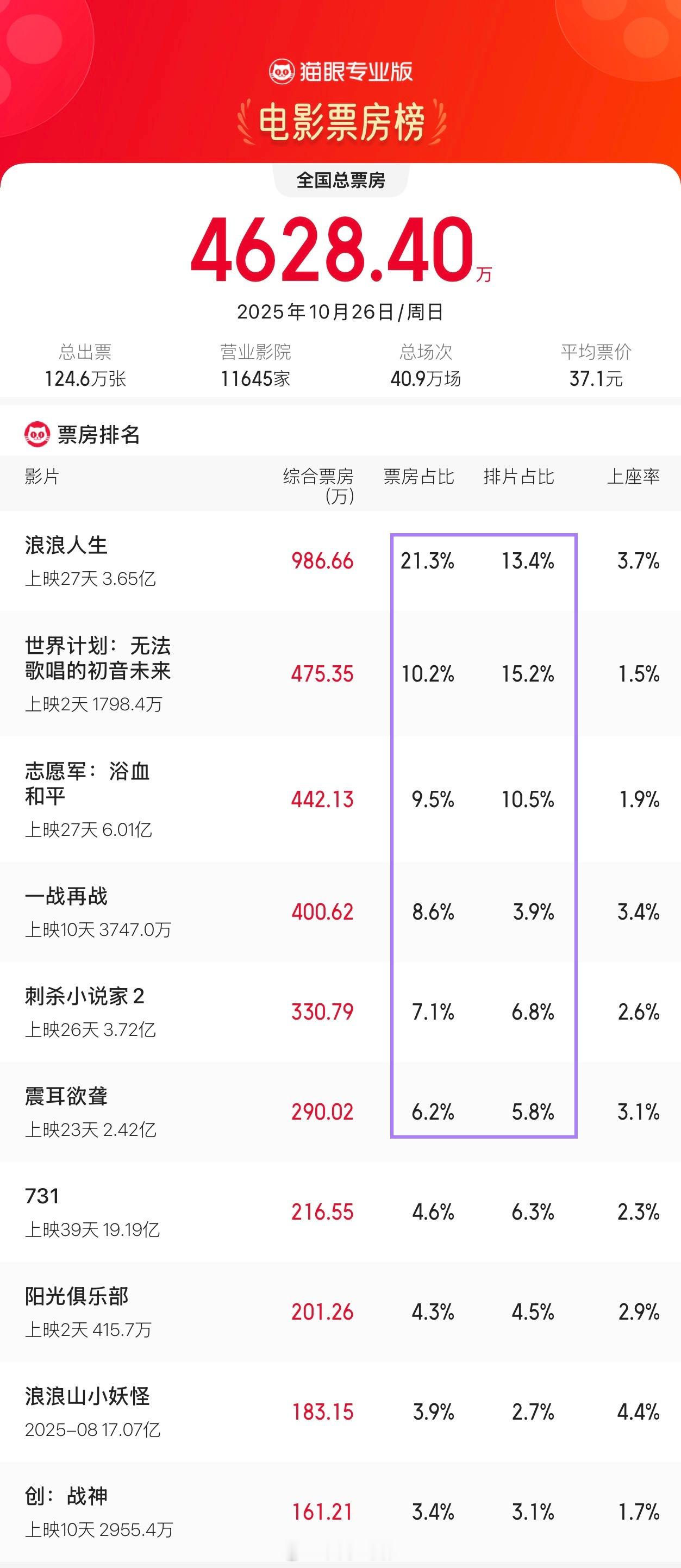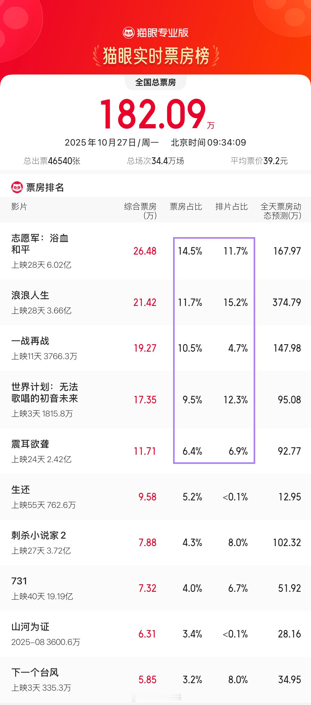 电影志愿军浴血和平票房破6亿很久没有电影破亿的消息了,恭喜💐《志愿军:浴血和平》上映27天,票房破6亿。新片无水花,大盘还是靠国庆档那几部电影,扛着重担往前走。田宇院线播报