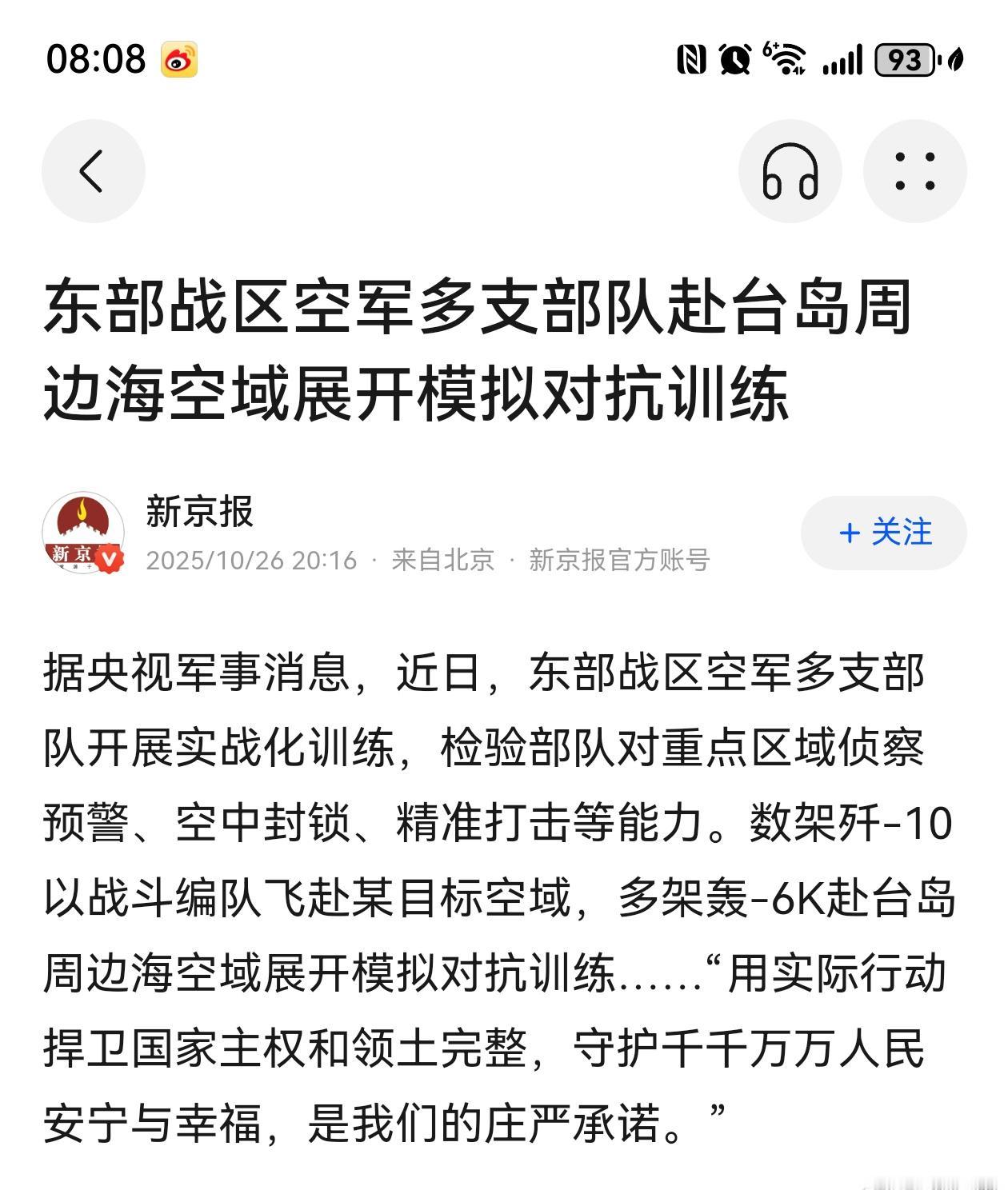 东部战区空军多支部队赴台岛周边海空域展开模拟对抗训练 据央视军事消息,近日,东部战区空军多支部队开展实战化训练,检验部队对重点区域侦察预警、空中封锁、精准打击等能力。数架歼-10以战斗编队飞赴某目标空域,多架轰-6K赴台岛周边海空域展开模拟对抗训练……“用实际行动捍卫国家主权和领土完整,守护千千万万人民安宁与幸福,是我们的庄严承诺。”