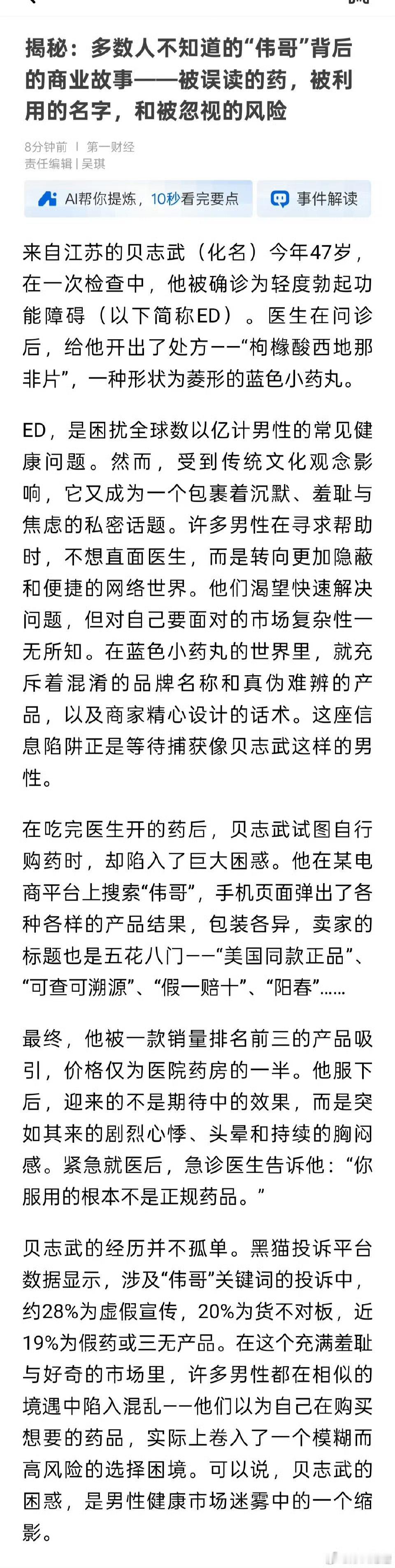 揭秘伟哥名称背后的市场乱象近两成投诉者称买到假伟哥这玩意儿居然也冒出来假货了,实在没想到。实际上伟哥一开始只是个俗称,后来被抢注成了商标,这玩意儿属于西地那非类药物,是处方药,需要凭借处方到医院和药房等正规场所购买。