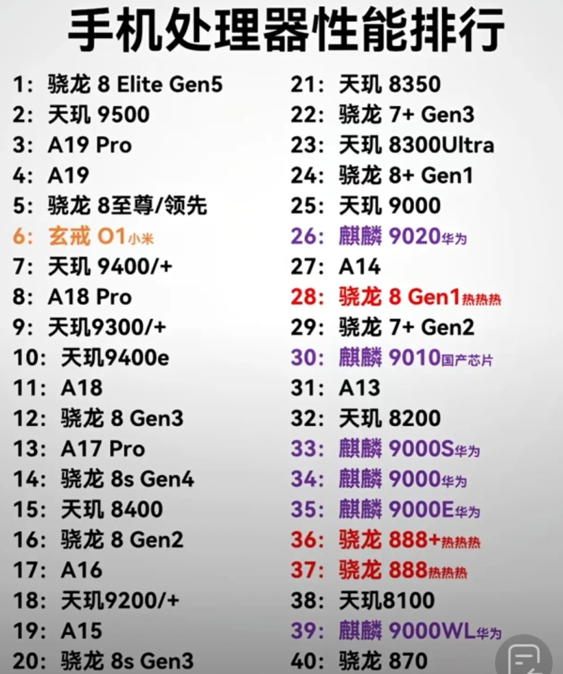 到目前为止手机处理器芯片性能排行榜,双十一要购机的可以参考一下。游戏发烧友选前3就对了,比较有性价比的是5到13,相当合适学生党。剩下的应付日常使用,还是游刃有余的。麒麟芯片被甩的有点远了,当然游戏一样是可以玩的,只是体验就稍微差一点了。