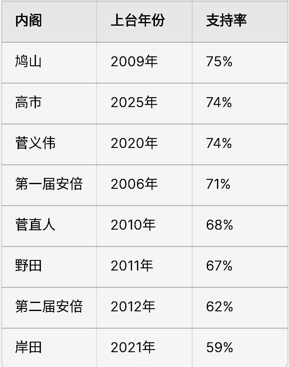 高市早苗刚坐进首相办公室,支持率就直接飙到74%,这数都快追上2009年鸠山终结自民党垄断时的75%了。咱们就来扒一扒她这所谓的“开门红”。 岸田那几年的日子,包括刚下台的石破茂,支持率恨不得贴地爬行,工资涨不动、物价飞着涨,政坛丑闻隔三差五冒头,民众看他那脸都快“审丑疲劳”了。这时候自民党把高市推出来,等于给吃腻了“馊菜”的观众上了盘“新菜”。哪怕这菜看着口味重,但架不住前面的菜太难吃,大家先夹一筷子“试试水”再说。 这74%的支持率,本质是“厌旧远大于喜新”的“接盘侠福利”。不是高市摸透了民众想要啥,是民众实在受够了之前的“摆烂局”,反正换谁都是自民党,不如换个“脸生的”,先给张“试用分”。就像我们点外卖,常吃的那家总踩雷,换个新店哪怕评价褒贬不一,先给五星“开个箱”,真不好吃再差评。现在日本民众对高市早苗,就是这心态。 四年前菅义伟上台也是74%的“开局王炸”,结果呢?疫情应对稀碎、奥运槽点满屏,支持率“自由落体”到二十出头,最后灰溜溜打包走人。这说明日本民众给新首相的“初始高分”,从来不是“终身VIP卡”,而是“7天无理由试用券”。试用期内没拿出真东西,说踢就踢,管你这那的。 说到底,这74%的支持率,就是日本民众“政治摆烂式期待”的缩影。不是相信你能变好,是实在没别的选,先让你顶一会儿。这波“开门红”能撑多久?我赌三个月内就得“现原形”,甚至时间还要短,咱们就当个吃瓜群众。