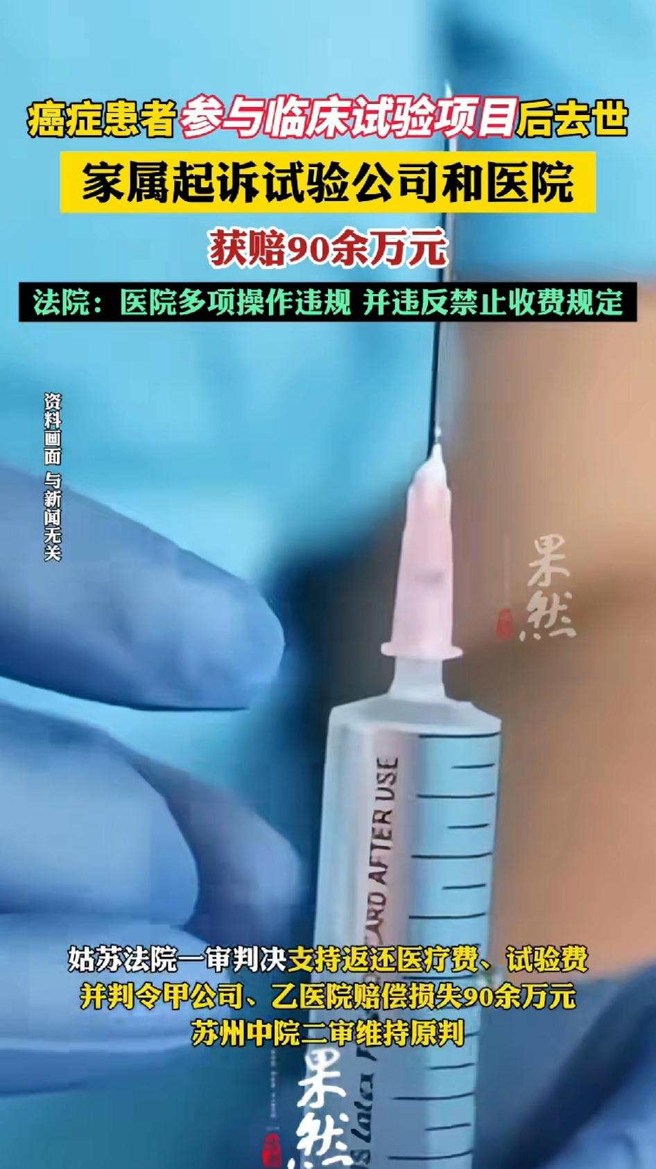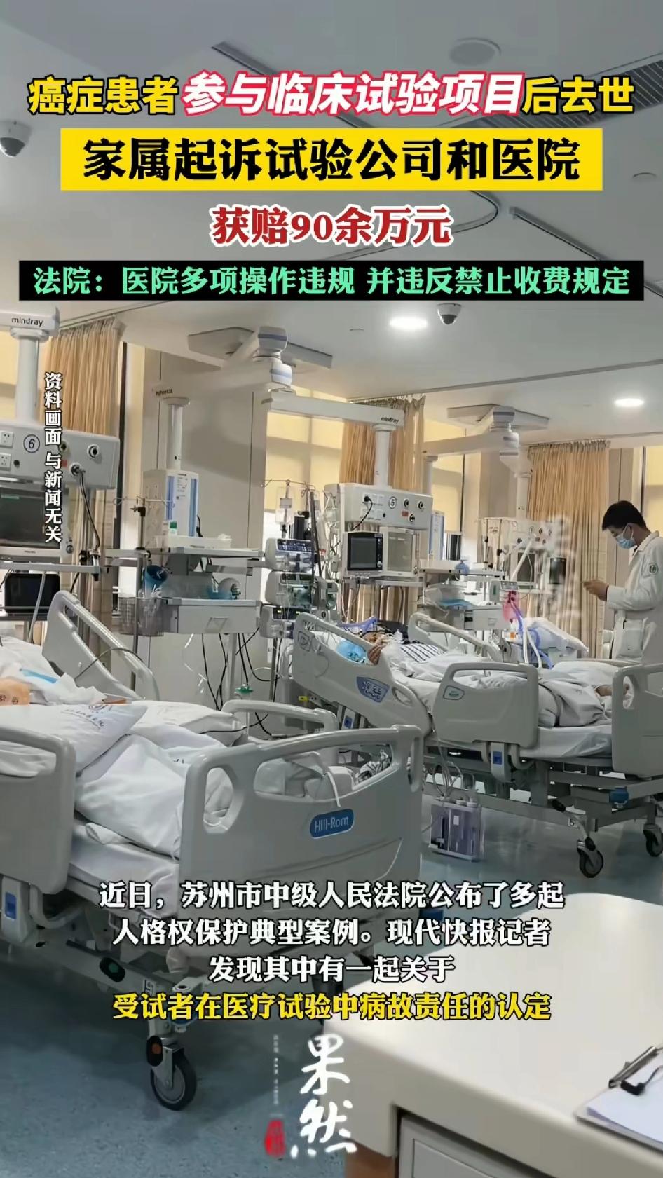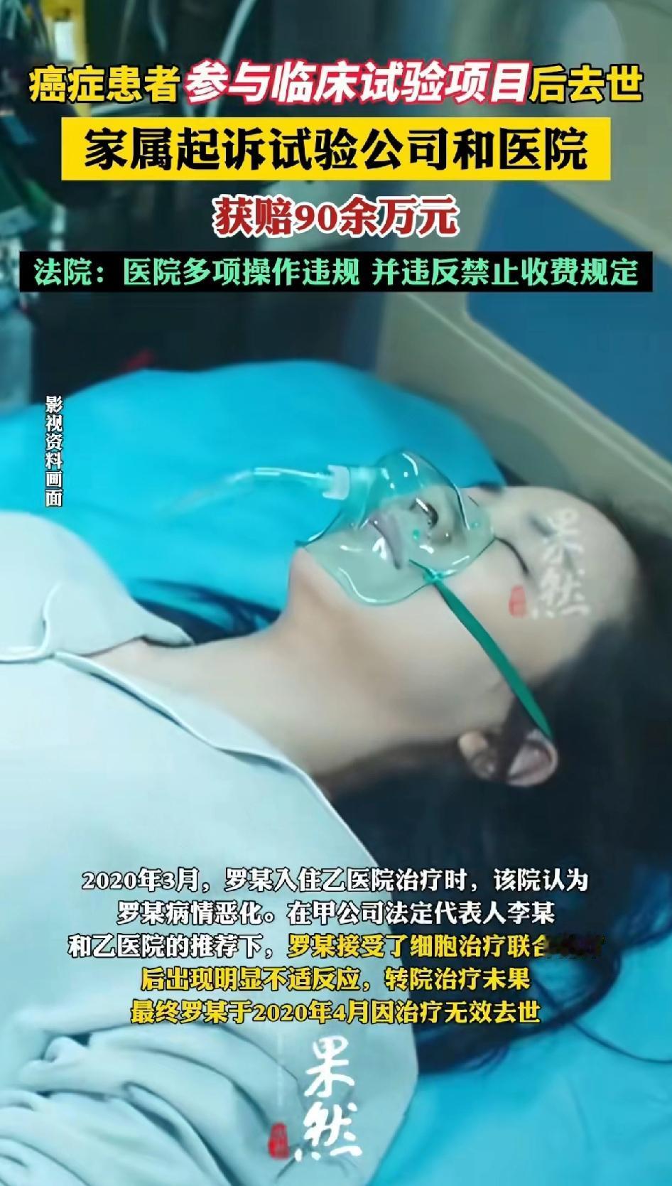 癌症患者参与临床试验项目后去世,家属起诉实验公司和医院获赔90万! 2020 年,患“多发性骨髓瘤”的罗某参加甲公司和乙医院合作的细胞治疗临床试验。 在治疗中病情恶化,经推荐接受细胞治疗联合化疗后不适,转院无效死亡,家属还支付过试验费。 本来抱着希望治疗,结果加快了死亡时间。 家属起诉后,法院判赔。原因是乙医院没按研究方案治疗,知情同意书未通过伦理审查,且有免除责任的违规内容,住院病案告知内容也不规范。 人心太黑了,癌症病人是被逼上绝路的人,本来已经无路可走了,才拖着病重的身体参与临床试验的,医院不但收取试验费,还多项违规操作,真是不拿病人当人看待。最终导致病人极速惨死。 这起案件给医疗临床试验敲响了警钟,必须严格遵守规范,保障患者权益,不然就该为自己的违规行为付出代价。