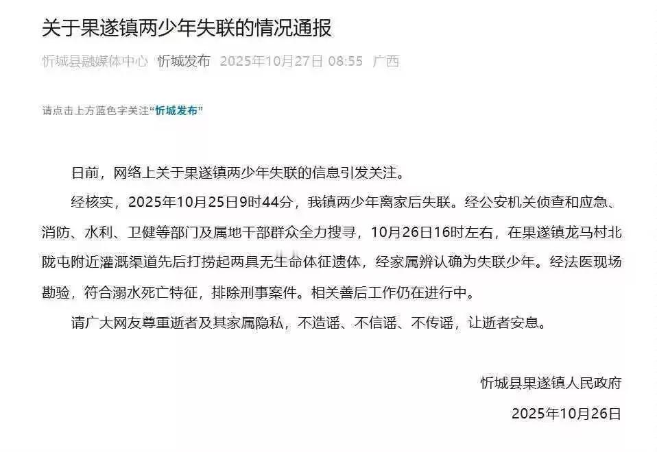 心碎!广西来宾两名13岁男孩,周六(10月25日)上午快10点骑电动车出门钓鱼,结果再也没回家。电动车、手机、鱼竿都在灌溉渠桥边上放着,人却不见了。全村人找了一天多,最后等来的是26日下午从南宁来的救援队从水渠里打捞起两具遗体的消息。官方通报是溺水身亡,排除案件,家里人27日就在办后事了。 这种悲剧年年有,灌溉渠看着水不急,但坡陡滑,掉下去很难爬上来。孩子才13岁,学校家长肯定都叮嘱过别骑电动车、别野钓,可贪玩的孩子总有办法溜出去。 生命太脆弱,水火无情真不是吓唬人的。希望家长多盯紧点,也盼村里能给危险水域加个护栏或警示牌。别再让找孩子变成捞孩子了。