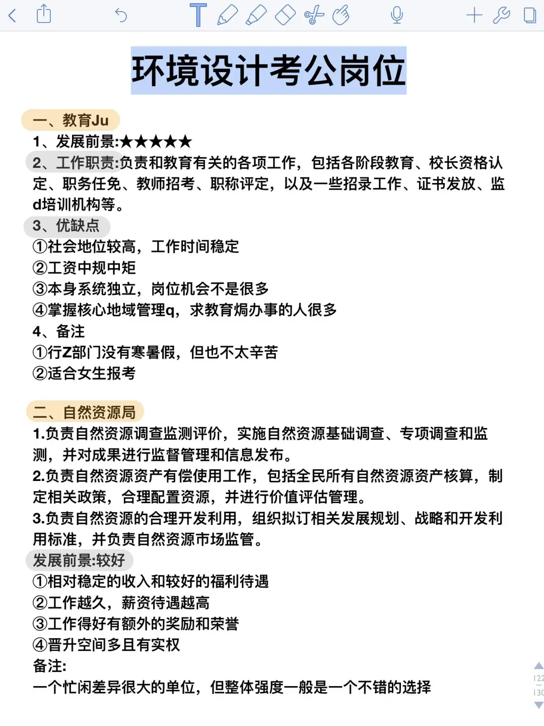 环境设计专业毕业远不止做设计这一条路! 你们有这么多公务员岗位可以考呢!! · 🎯环境设计专业级所属大类 环境设计从属于设计学类,属于艺术学门类,设计学类主要包括视觉传达设计、环境设计、产品设计、公共艺术、数字媒体艺术等 · 🎯考公相关岗位 规划与自然资源部,住建部,文旅,环保部,事业单位等。 · 🎯岗位占比 要求本科学历的岗位占比:95.69% ;要求仅限本科的岗位占比:13.02% ;要求研究生及以上的岗位占比:4.3% 。 · 📚备考建议 1️⃣明确目标岗位:环境设计考公岗位相对较少,建议多管注规划部门和事业单位。 2⃣申论:千万不要堆在最后学! 小题重点在“抄材料”!速读提取关键信息,作答逻辑清晰、层次分明、格式规范、用语简短专业一定要动笔写!注意字体工整,练习时以考试标准规定时间+格式+字数。 3⃣行测:最快的提分方法是刷真题+整理错题模块,复习推荐顺序:判断一言语一资料一数量一常识,重心放在前三个板块,正确率不低于80%后再去攻数量和常识,近5年的国考和省考题,做完后及时总结错题