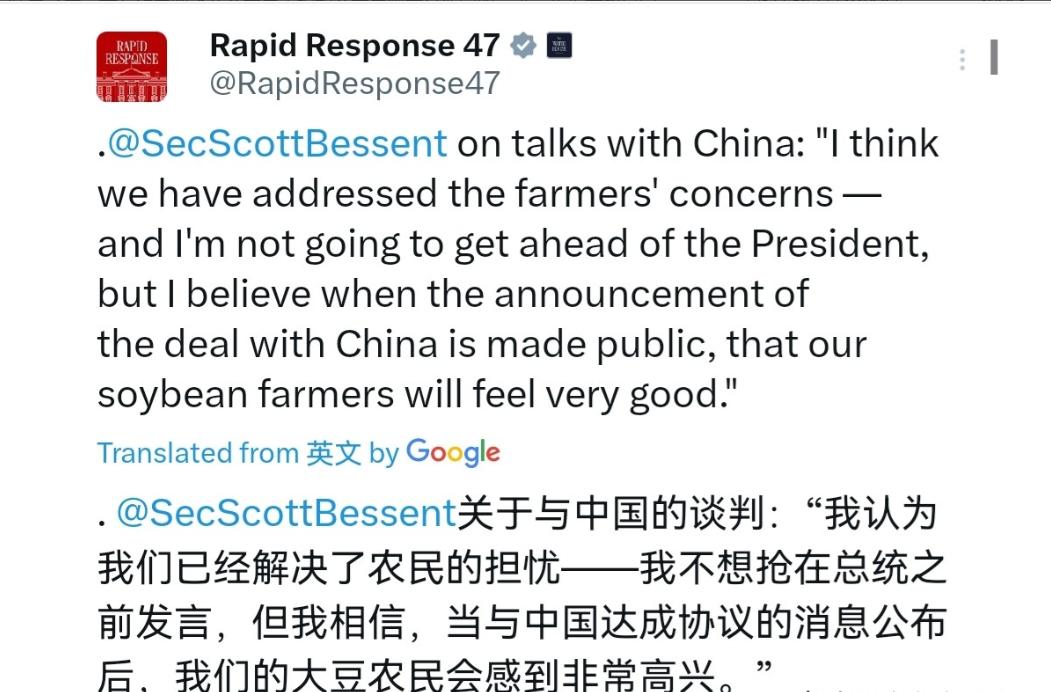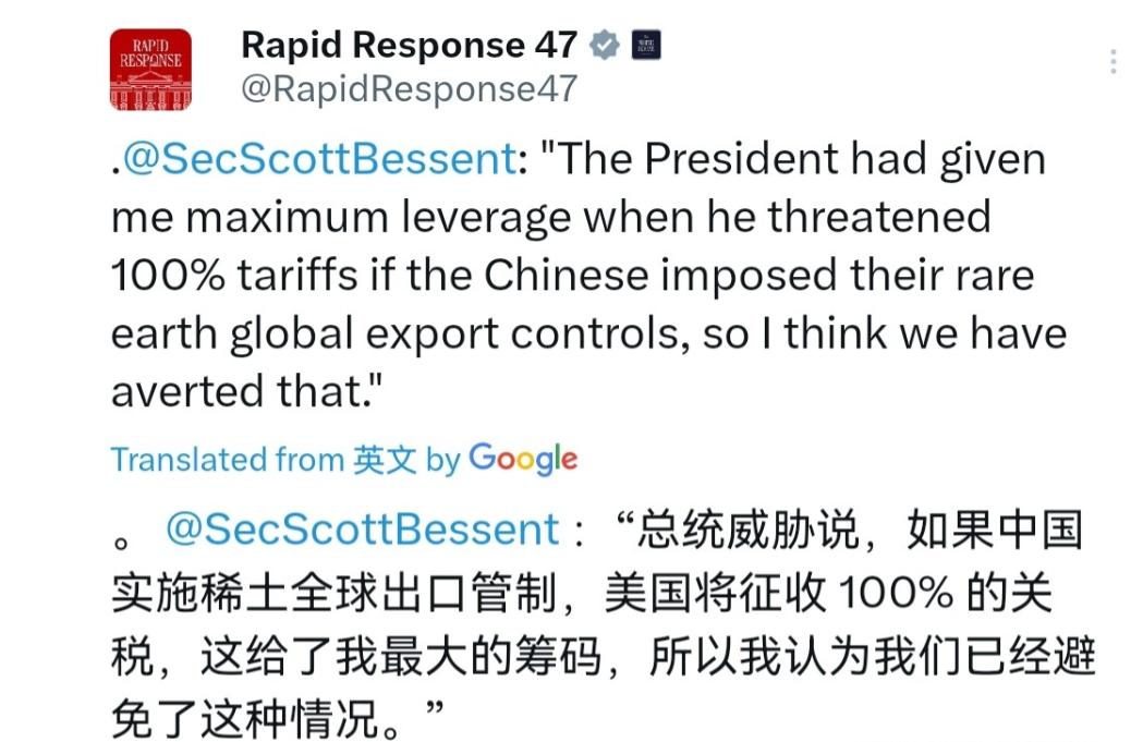 贝森特出来讲话了,中美达成的部分协议被美国曝光!10月26日,美国财长贝森特在接受采访时表示,特朗普总统在11月1日威胁要征收100%的关税,给了我很大的谈判筹码——我相信我们已经达成了一个非常实质性的框架,可以避免这种情况,并允许我们与中国讨论许多其他事情。所以我认为我们已经避免了这种情况。 咱们先把来龙去脉捋清楚,省得大家看糊涂,美方一开始又拿关税吓唬人,特朗普放话说11月1号要对中国商品加征100%的关税,说白了就是想拿这个当筹码,逼着咱们在谈判桌上让步。 贝森特自己也承认了,这个威胁给了他所谓的“谈判筹码”,这话听着挺气人,但也暴露了美方的心思——就是想靠施压占便宜。 但咱们中国从来不吃这一套,这次谈判是国务院副总理何立峰带队去的吉隆坡,跟贝森特他们谈了两天,咱们的态度很明确:谈可以,但必须平等,得相互尊重,不能搞胁迫那一套。 何立峰早就说了,中美经贸关系本来就是互利共赢的,合则两利、斗则俱伤,真要打贸易战,他们美国自己也扛不住。 你看之前美股好几次因为贸易摩擦大跌,就知道他们所谓的“关税威胁”其实是双刃剑,伤咱们也伤他们自己。 结果还不是得坐下来好好谈,而且谈出了实际成果。 贝森特说达成了“非常实质性的框架”,咱们官方也说了,双方就好几个关键问题达成了基本共识,这其实是一回事,就是双方都认可这个结果。 具体谈成了啥?说出来大家都能明白,比如美国之前嚷嚷着要加的100%关税彻底黄了,贝森特自己都承认“不再考虑”了,这就是最直接的成果。 还有稀土的问题,之前咱们搞出口管制,美方急得跳脚,现在双方谈妥了,这威胁自然就没了。 另外还有几个实在的事儿,比如美国对咱们造船业和海事物流的特殊关税措施,这次也谈出了解决办法;双方互相免的那些关税,暂停期也能延长了,这对两国的商家和老百姓都好,起码物价不会因为关税涨得太离谱。 还有芬太尼的问题,不只是关税,连执法合作都达成了共识,这说明不只是谈生意,还在解决实际的跨境问题。 农产品方面也有进展,咱们可能会多买些美国的大豆之类的,他们也能赚点钱,这不就是互利共赢嘛。 别听美方说什么“关税是筹码”,真要论底气,咱们可不比他们差,这次谈判前,美方态度挺强硬的,这是明摆着的,但咱们中方维护自身利益的立场更坚定。 商务部的人也说了,讨论过程很紧张,但咱们就是寸步不让该争取的利益,最后能达成共识,是因为双方都看清了现实——打没有好处,只有谈才能解决问题。 贝森特自己之前也说过,那么高的关税根本“不可持续”,这话算是说了句实话。 现在这个框架是搭起来了,但不是说事儿就完了,接下来双方还得把细节敲定,各自走国内的批准程序,毕竟这么大的事儿不能马虎。 而且再过几天APEC会议就要开了,中美元首可能还会见面,到时候说不定能把这事推进得更快。 这成果来得不容易,是谈了好几轮才成的,从5月到现在,这已经是第五次面对面磋商了,中间的博弈可想而知。 说到底,这事儿最关键的还是证明了一点:中美之间再大的分歧,只要坐下来平等对话,就有解决的可能。美方那些威胁恐吓的手段,根本不管用,咱们中国一直抱着合作的态度,但绝不妥协,这才有了现在的结果。 对咱们老百姓来说,这也是个好消息,贸易稳定了,物价能稳点,做生意的人也能更安心,整个经济环境都会好一些。 所以别被美方那些“筹码”的说辞带偏了,这不是他们施压的胜利,是双方都认清现实后的理性选择。接下来就看双方能不能好好落实,别出什么岔子。 毕竟合则两利的道理,谁都懂,就看能不能实实在在做到位。 参考资料: 环球网《围绕多项重要经贸问题,双方进行“建设性的”探讨,中美吉隆坡磋商达成基本共识》