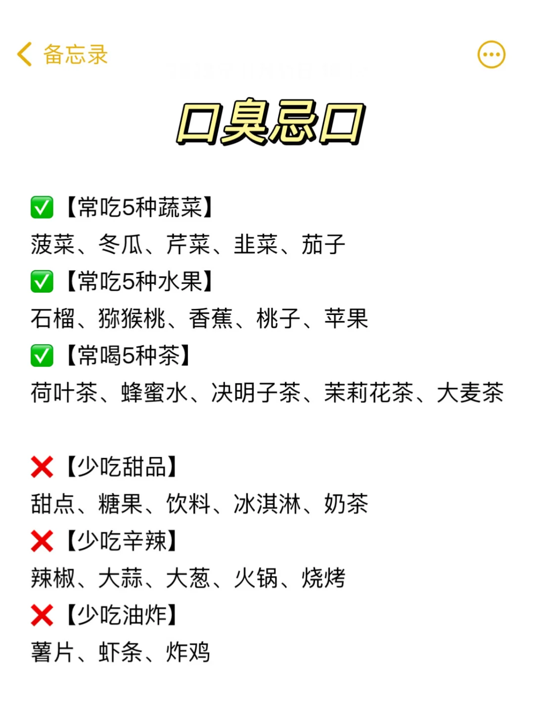 这个共同特点就是不注意饮食,不注意口腔卫生❗️ 👉很多人都是,每天晚上吃完东西都不刷牙直接睡了,也不经常漱口,结果就是口气很重,跟人说话时对方都表现出嫌弃的神情,搞得自己也怀疑人生了。 后来才知道,是肠胃不好引起的口臭😷,这才按照方法慢慢调理好起来了~ . ✅饮食一定要调整! 【常吃5种蔬菜】菠菜、冬瓜、芹菜、韭菜、茄子 【常吃5种水果】石榴、猕猴桃、香蕉🍌、桃子、苹果 【常喝5种茶】荷叶茶、蜂蜜水、决明子茶、茉莉花茶、大麦茶 【少吃甜品】甜点、糖果、饮料、冰淇淋、奶茶 【少吃辛辣】辣椒🌶️、大蒜、大葱、火锅、烧烤 【少吃油炸】薯片、虾条、炸鸡 . ✅去除口臭的小贴士: 1.口臭可能是肠胃不好导致的,可以喝些清口的茶🍵,丁香、栀子、茯苓、甘草、蒲公英、决明子搭配好,用开水冲泡5分钟代茶饮~呵护肠胃的同时压压口气。 2.刷牙时多刷舌苔处。 3.每天坚持运动半小时,多做有氧运动,如跳绳、跑步🏃‍♀️、游泳。 4.尽量不吃辛辣刺激的食物,避免刺激肠胃。 .