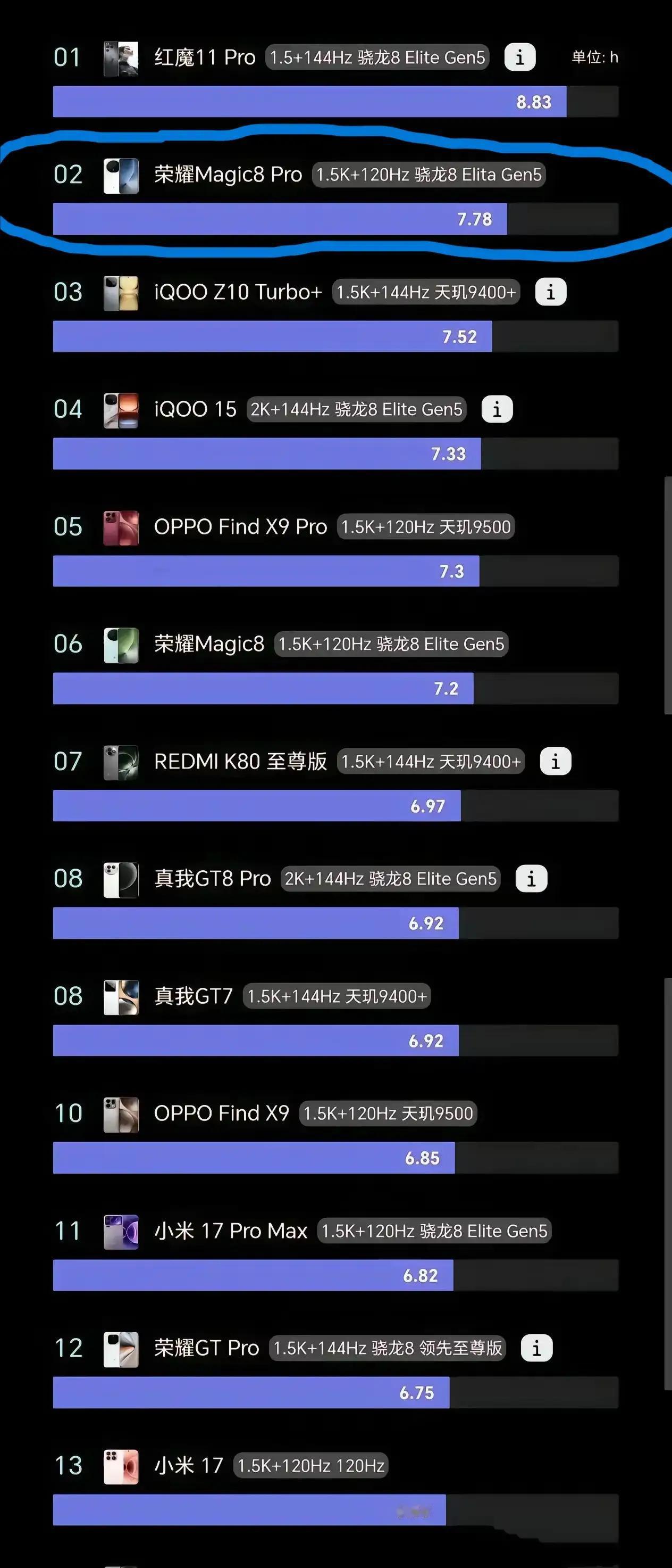 荣耀再次证明:续航的强大,不在于电池的单纯大小! 荣耀Magic 8 Pro用7200mAh的电池,实现了超越8300mAh机型的续航表现,登顶续航榜前列。这背后,是青海湖电池技术在能量密度上的绝对领先。 当别人还在堆容量时,荣耀早已换了一条赛道,这就是技术的底气。