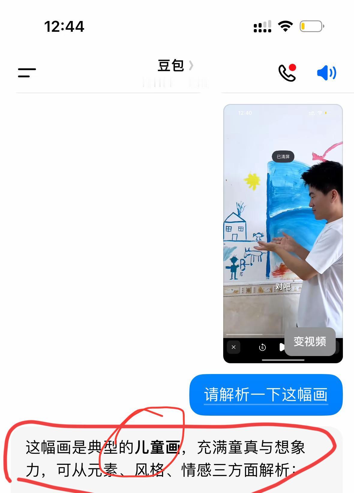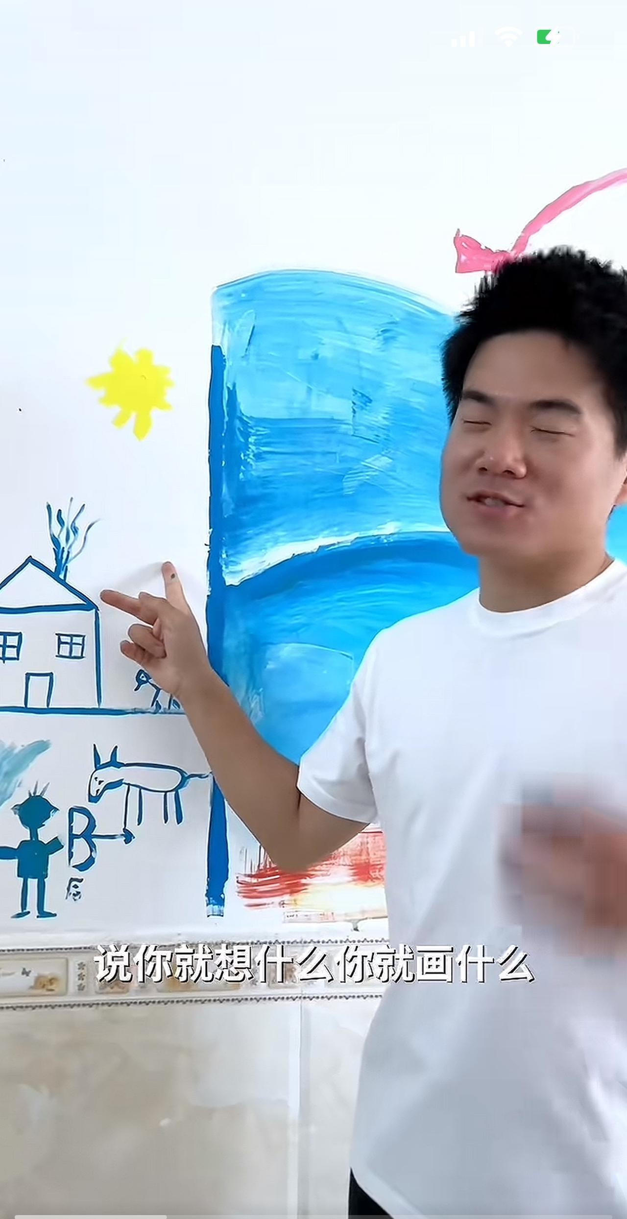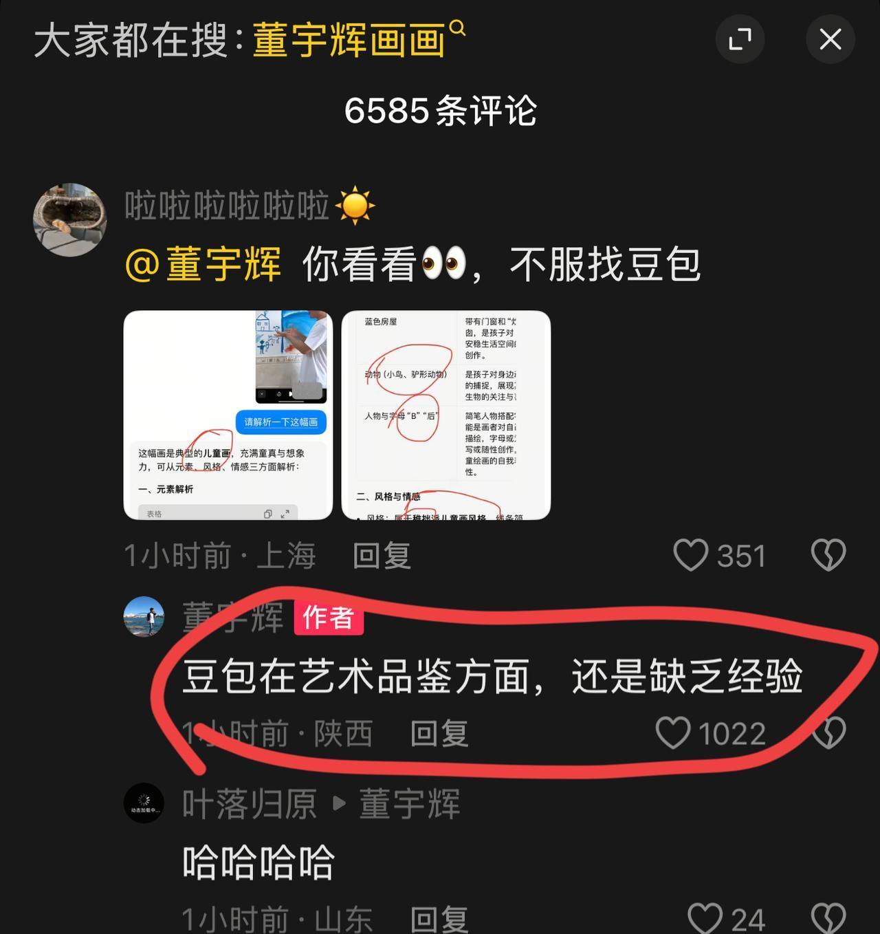 我终于找到一个和宇辉的共同点了, 就是在绘画这方面, 想象力丰富, 画风抽象, 技术稀烂。[大笑][大笑][大笑] 宇辉更新视频了, 是他在《向新而行》广西篇节目中的一副现场手工画, 实话实说, 这幅画技术很真实但是也很稚嫩, 连豆包都说他这幅画是典型的儿童画, 充满了童真的想象力, 可是这小子主打一个嘴硬, 说这是豆包在艺术鉴赏方面, 缺乏经验。 绘画技术好不好不是重点, 重点的是这小子会自我解读啊, 他对这幅抽象画天马行空的一顿解读, 好像还真的就是那么一回事, 听到最后, 我开始了自我反思, 哦,不是宇辉的绘画不好, 而是他的艺术天赋太高, 这幅画属于高深的“抽象”派, 我们没能领会其中的精髓, 其实不是宇辉的错, 是我们自己不懂而已……[大笑][大笑][大笑] 算你小子狠, 一副儿童画你就这样一本正经的在那里讲解半天, 我也听了半天, 最后我还是得出一个结果, 这小子绘画技术和我一样稀烂, 也许这是我和他唯一的相似之处。 211抖大同学里面不乏人才, 有人这样解读宇辉的画: “从画上可以看出, 1.自己在下,说明人很谦卑, 2.房子在中间,说明家庭在心里最重要, 3.动物都很大,说明敬畏自然万物。 4.天空中有两个太阳,手拿弓箭🏹射下一个太阳, 说明内心非常有秩序感和正义感。到底还是我浅薄了, 没能读懂宇辉, 看来我还得加油啊! 散会! 董宇辉