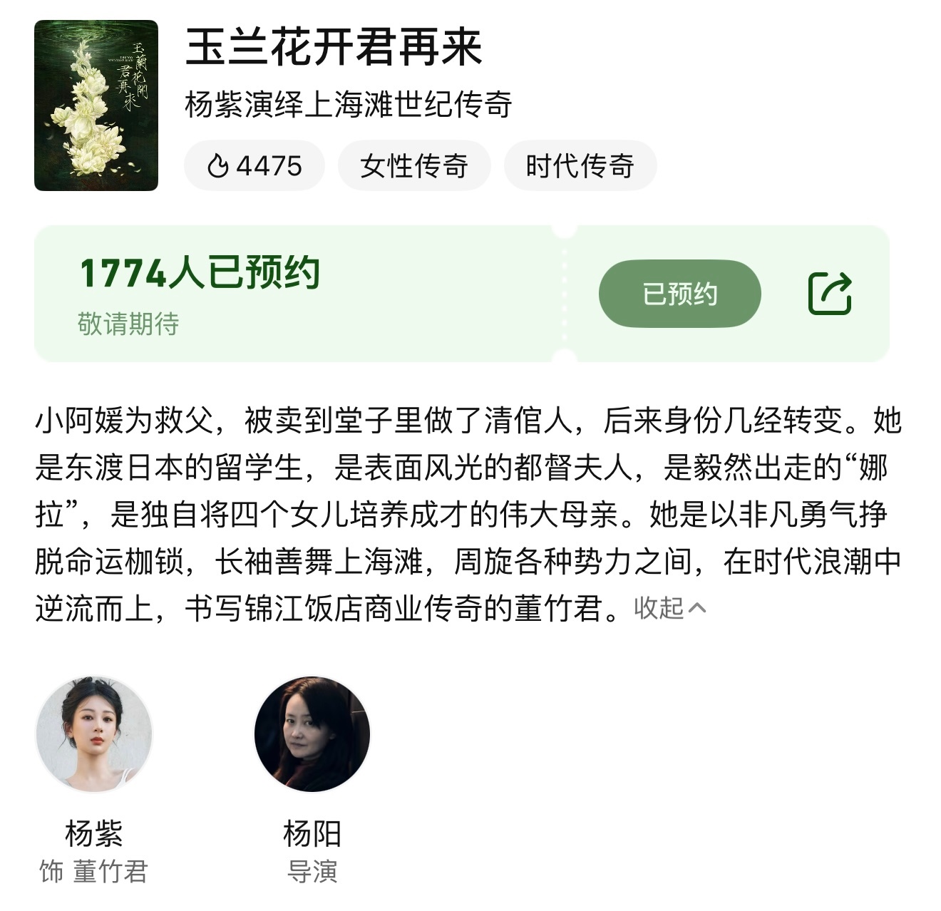 时代传奇,女性成长史诗,是自救者是破茧人,是玉兰花更是野心家[期待]杨紫玉兰花开君再来人设