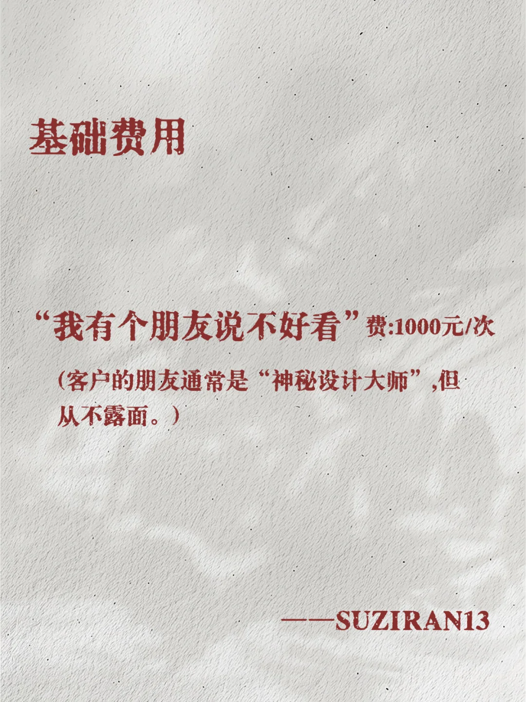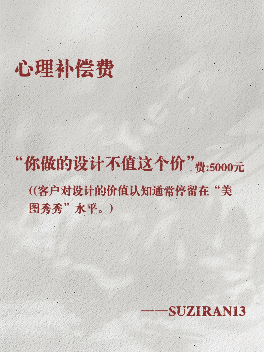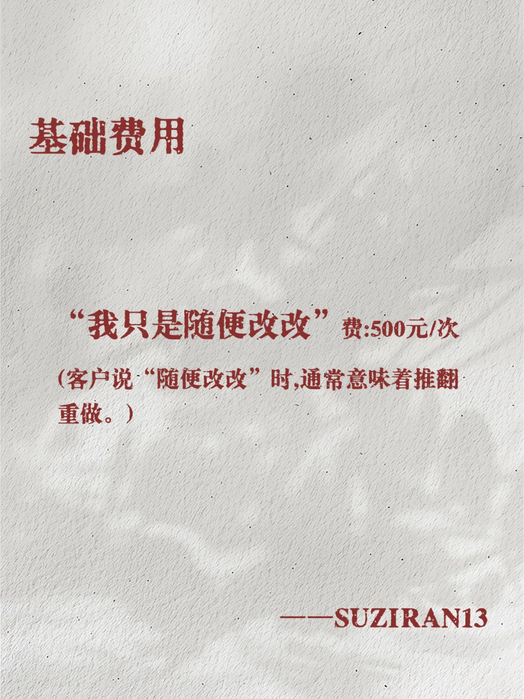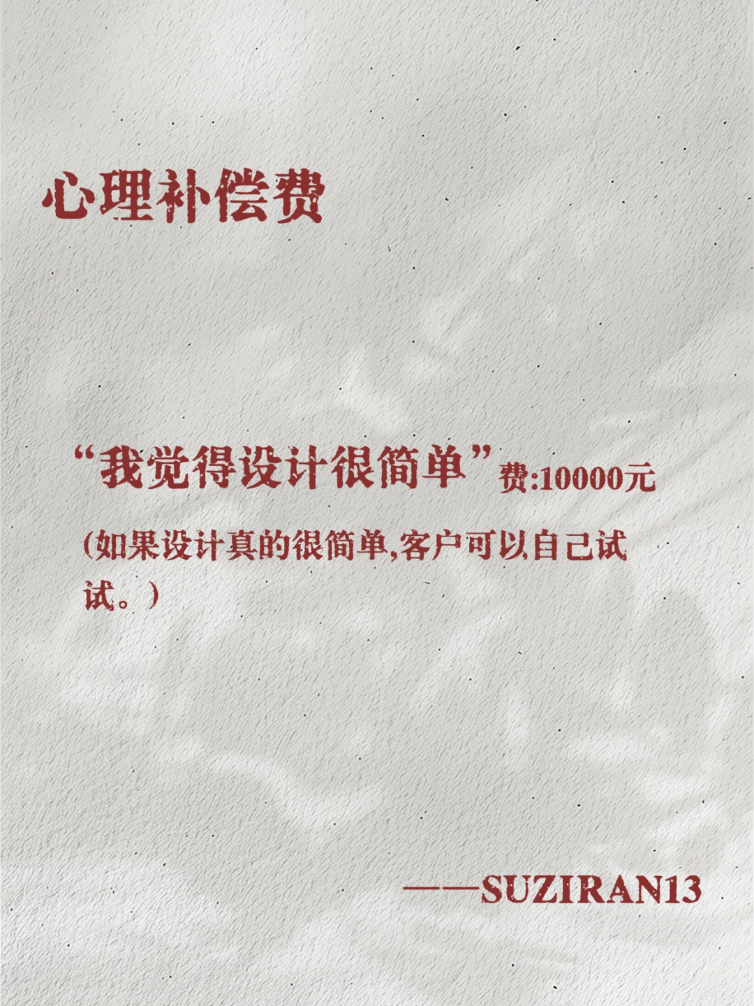 [打卡R]做设计的谁看了不心梗!“随便改改”费500、“朋友说不好看”费1000…还有“五彩斑斓的黑”费10000,物理难实现的需求收费必须狠![黄金薯R] [打卡R]最绝的是“第一版最好”费5000,改10轮回到最初,谁懂啊![哭惹R][哭惹R][哭惹R] [打卡R]但尊重设计免费!只要客户尊重设计师劳动,费用全免~友情价双倍,真朋友不让设计师白干![哇R] [打卡R]设计是时间、经验和创意的结晶,尊重设计师,就是尊重创意本身~[喝奶茶R]