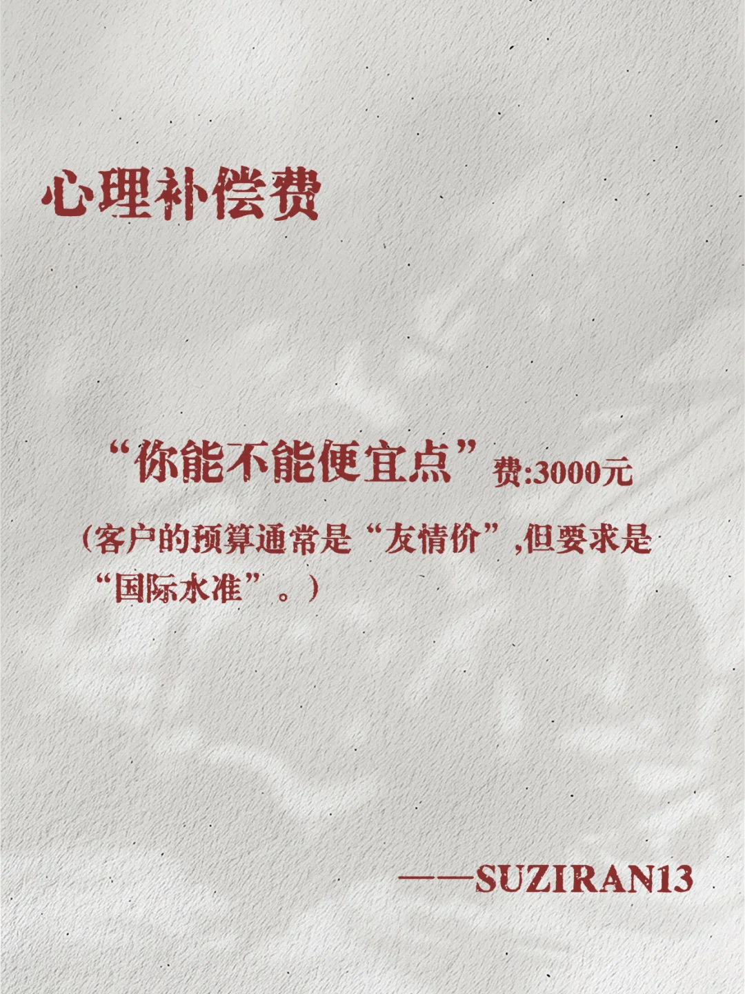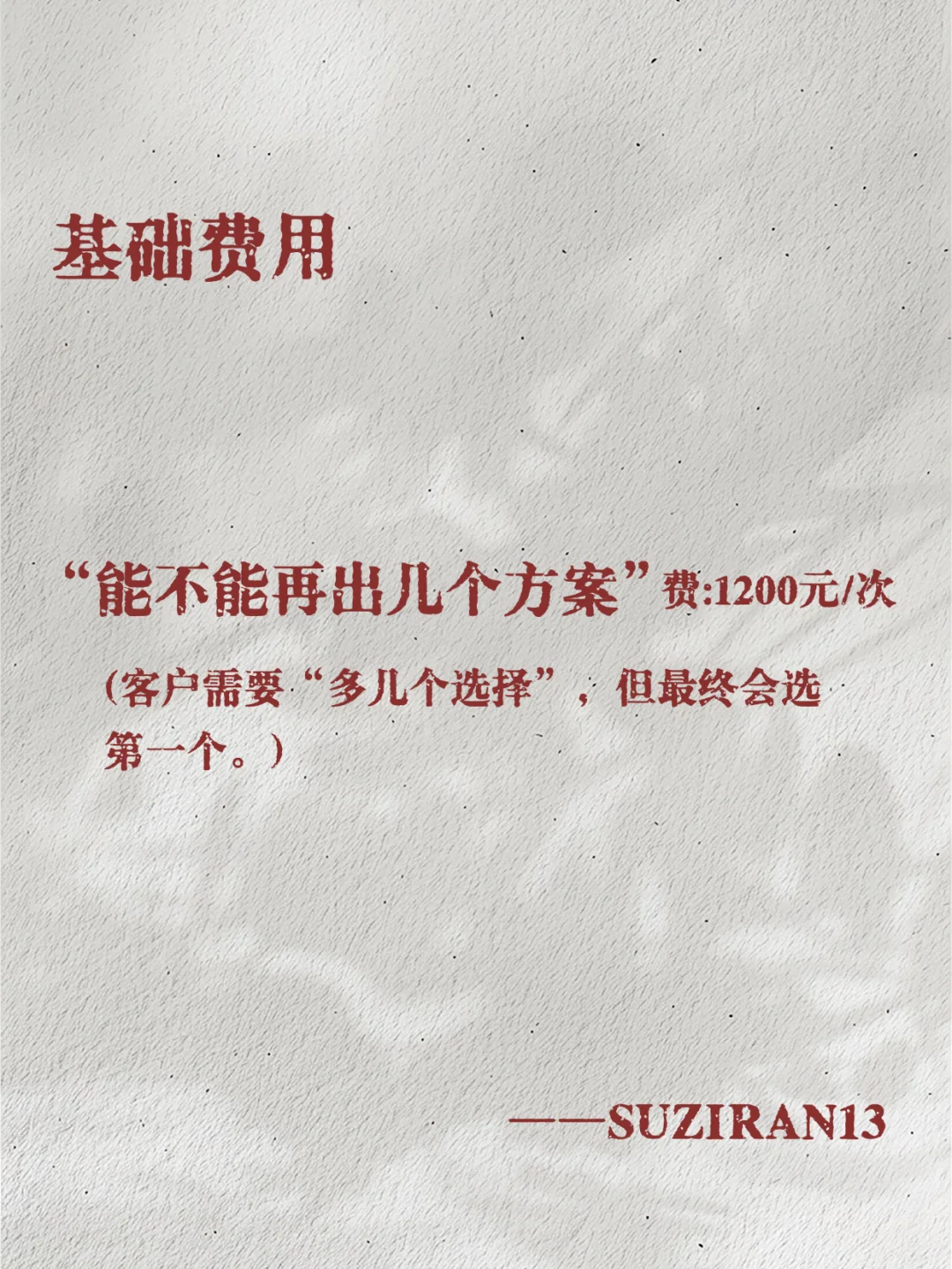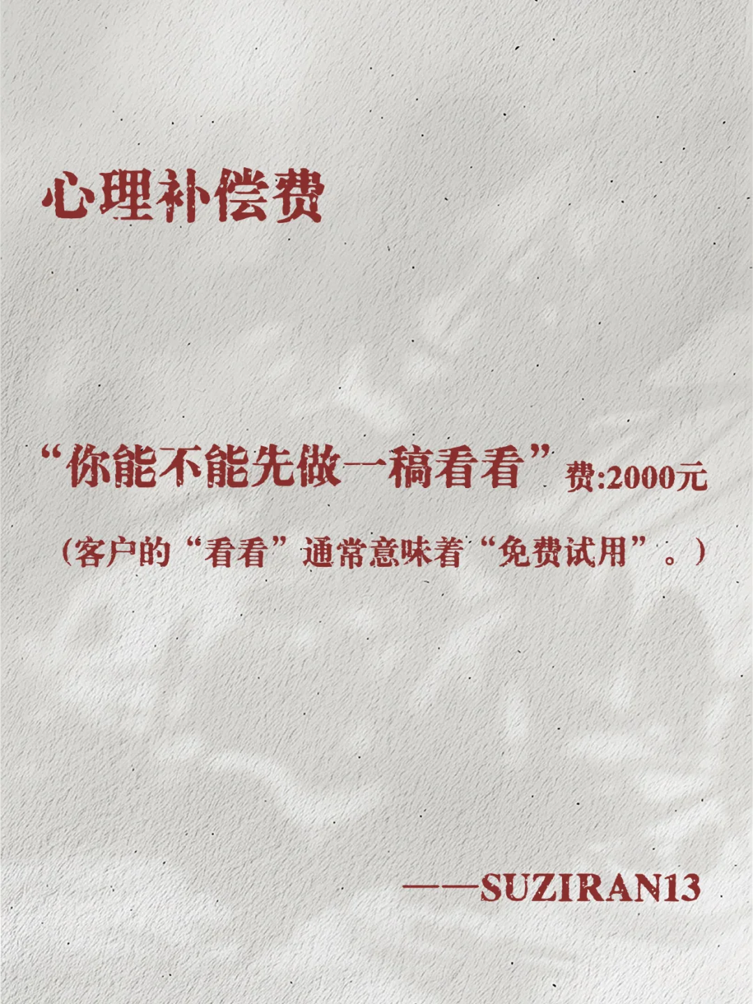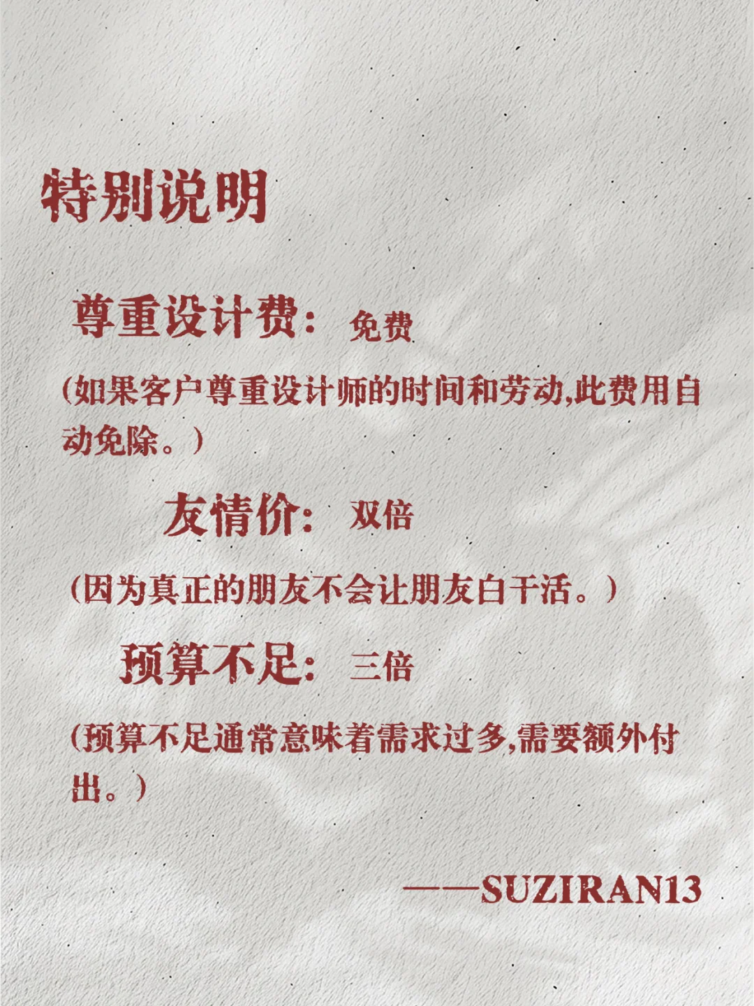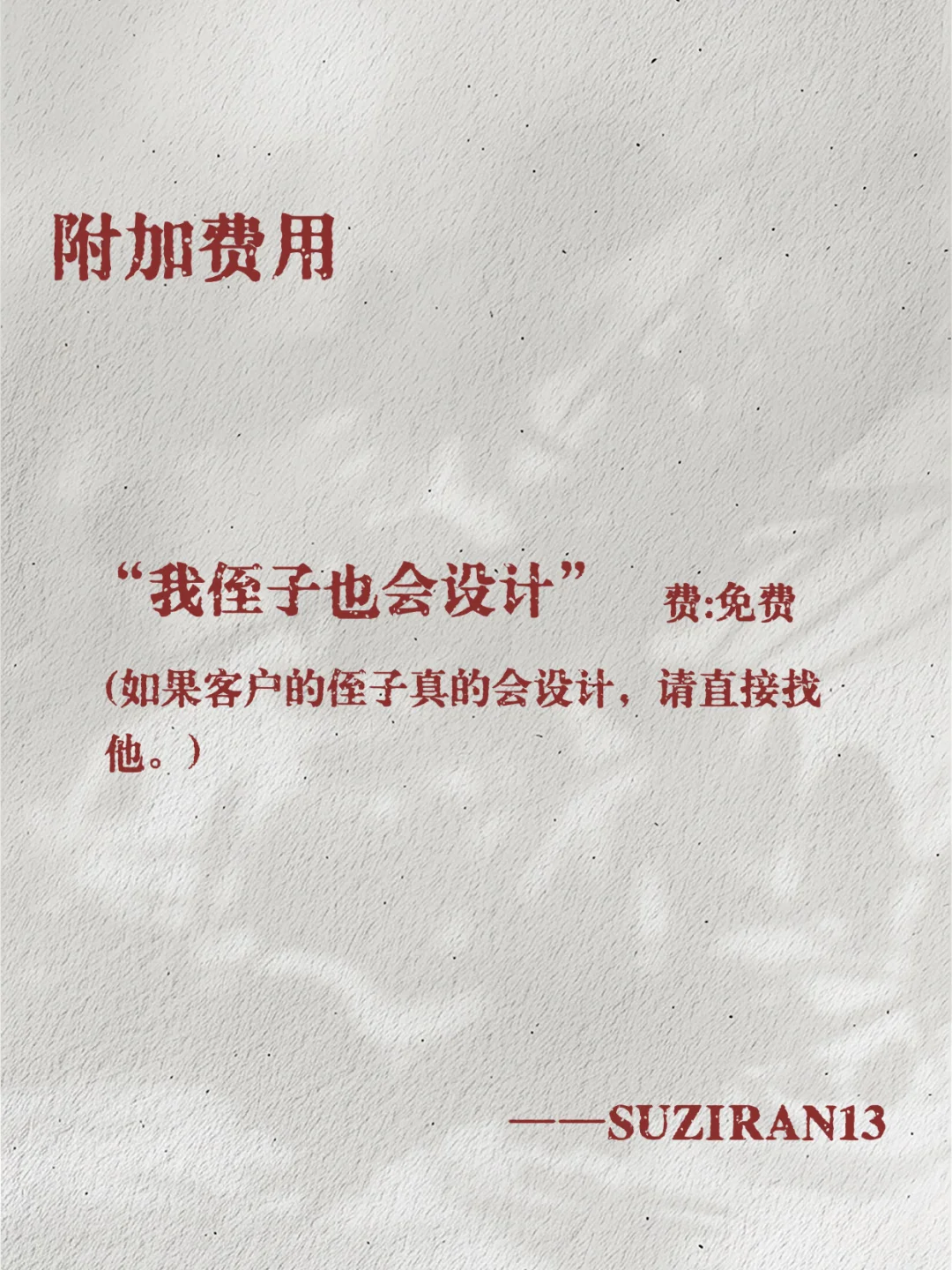 [打卡R]做设计的谁看了不心梗!“随便改改”费500、“朋友说不好看”费1000…还有“五彩斑斓的黑”费10000,物理难实现的需求收费必须狠![黄金薯R] [打卡R]最绝的是“第一版最好”费5000,改10轮回到最初,谁懂啊![哭惹R][哭惹R][哭惹R] [打卡R]但尊重设计免费!只要客户尊重设计师劳动,费用全免~友情价双倍,真朋友不让设计师白干![哇R] [打卡R]设计是时间、经验和创意的结晶,尊重设计师,就是尊重创意本身~[喝奶茶R]