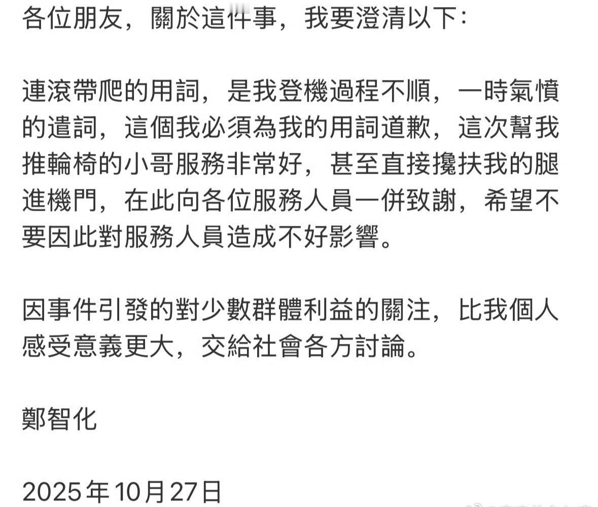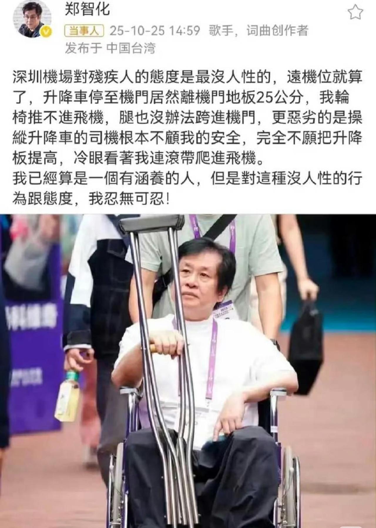 谁能料到, 一句“连滚带爬”竟引得全网对郑智化心生心疼? 更令人意想不到的是, 他不仅没发怒,反倒主动致歉!10月27日,他发文坦诚:当时登机困难重重,情绪一时失控,用词有所不当,特向大家道歉。 他还特意提及那个推轮椅的小哥:“真帮了我大忙,一路扶着我,甚至连我的腿都帮着抬进了机舱。”他恳请大家不要责怪工作人员,他们工作辛苦,且尽心尽力。 说实话,听到这些,眼眶不禁发酸。一个坐轮椅的人,面对飞机门口那短短25厘米的距离,却好似要翻越一座大山。可他在气过、难受过后,想的却是不让一线员工承担责任,还借此事呼吁大家关注残障群体出行难的问题。 这才是真正的格局!不只是一味发泄情绪,而是凭借自己的声音,为更多人争取尊严。深圳机场也迅速进行了整改,这份认真负责的态度,值得称赞! 他替我们问出了那个问题:这个社会,究竟能否对“不方便”的群体多一些便利? 若你也被这份清醒与善良所打动,别忘了点赞、转发,让更多人看到!关注我,咱们一同为温暖发声。