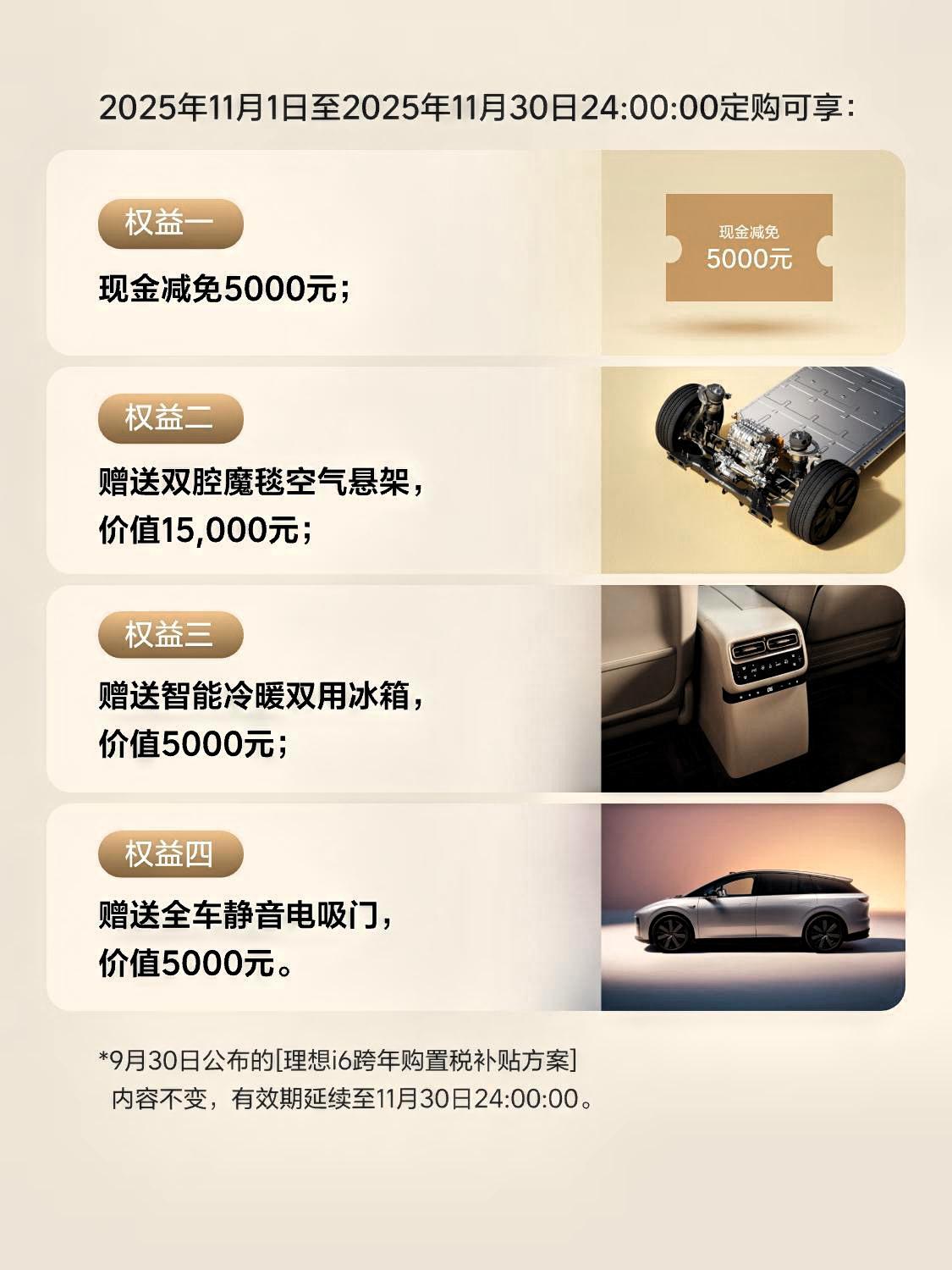理想i6,11月限时购车权益来了。 2025年11月1日至2025年11月30日24:00定购可享,总价值30,000元。 权益一:现金减免5000元; 权益二:赠送双腔魔毯空气悬架,价值15,000元; 权益三:赠送智能冷暖双用冰箱,价值5000元; 权益四:赠送全车静音电吸门,价值5000元。 理想汽车理想i6 说到理想汽车,这个品牌一直在国产新能源车中占有一席之地,尤其是它的车型,不仅在设计上强调科技感和未来感,还在智能系统上不断推陈出新。这次理想i6的限时购车权益活动,显然是为了吸引消费者的眼球,尤其是在激烈的市场竞争中,汽车厂商想通过“送豪礼”来为自家车型打打广告,增加销量。 通过这次活动的四大权益,理想i6确实为消费者提供了不少诱惑。现金减免5000元,这个优惠直接降低了购车的门槛,减轻了消费者的负担。而赠送的双腔魔毯空气悬架,价值15000元,看起来像是个高端配置,可以提升乘坐的舒适性,毕竟空气悬架在高端车上已经不再是什么新鲜事。对于喜欢追求驾驶体验的人来说,这样的配置无疑是加分项。 智能冷暖双用冰箱的赠送,虽然看起来有些“另类”,但它体现了理想汽车对细节的重视。毕竟,车内冰箱在长途驾驶时确实能提升舒适感,特别是在炎热的夏季或者寒冷的冬季,冰箱的存在使车主能够享受更多便捷。全车静音电吸门同样是一个与“舒适”挂钩的功能,车门的静音效果和电吸功能,意味着更好的隔音效果和更高级的自动化体验,提升了车辆的豪华感。 但是,虽然这些赠品看上去很诱人,我们也不得不提一个潜在的问题——这类促销活动真的能让消费者真正感受到物超所值的感觉吗?比如,双腔魔毯空气悬架确实是一项技术先进的配置,但对于很多消费者来说,他们可能并不会因为一个悬架系统就突然决定购车。空气悬架的复杂性和维护成本也许会让部分购车者望而却步。如果这些赠品的价值并不能在消费者的日常用车中提供持续的价值,那这笔“赠送”的优惠就有点虚高了。 再看智能冷暖冰箱,虽然它在某些特定场景下很实用,但说实话,冰箱作为车载设备,是否真的能成为购车决策的决定性因素呢?从整个市场趋势来看,消费者越来越看重的是车内的智能化程度、驾驶辅助功能、续航表现以及车载系统的优化,而这些可能比一个冰箱更能打动消费者。 价格和配置的平衡一直是车主购车时的重要考虑因素。理想i6通过这类赠送的方式,看似在降价,但实际情况如何呢?赠品看似很有吸引力,但如果原本的车价已经较高,消费者是否会被这些额外赠品“迷惑”,忽略了车本身的价值和长期拥有成本呢?更高的车价,或许就意味着更多的市场压力,毕竟消费者对价格的敏感度在目前的市场环境中不可小觑。 不过,作为消费者,我们也得承认,这样的促销活动对于那些对理想i6情有独钟,但又略感犹豫的潜在买家来说,确实是一个不错的诱因。如果这些赠品恰好符合自己的需求,那就很容易促成最终的购买决策。毕竟,品牌和车企现在不仅仅是在卖车,而是在卖一种全新的出行体验,一种让消费者能够在日常生活中感受到科技带来的便利的生活方式。 总的来说,理想i6这次的限时购车权益活动,看起来确实挺有吸引力的,但是否真正能够转化为销量,还是需要更多消费者的实际体验来验证。赠品背后的价值,是否能给消费者带来实际的感受,这才是理想汽车应该考虑的核心问题。 各位读者你们怎么看?欢迎在评论区讨论。