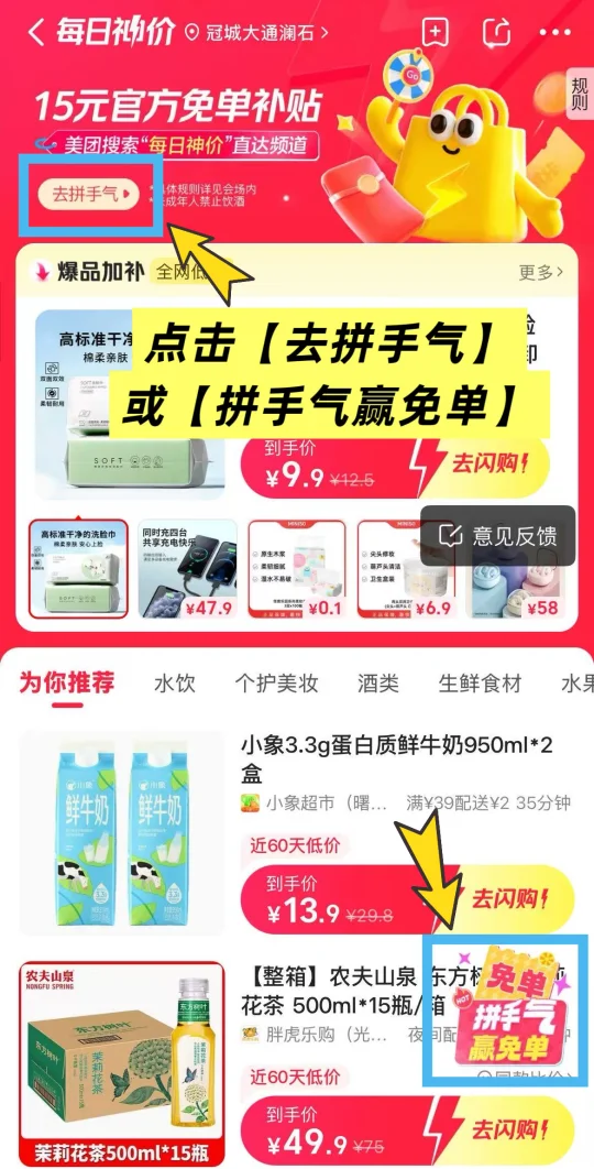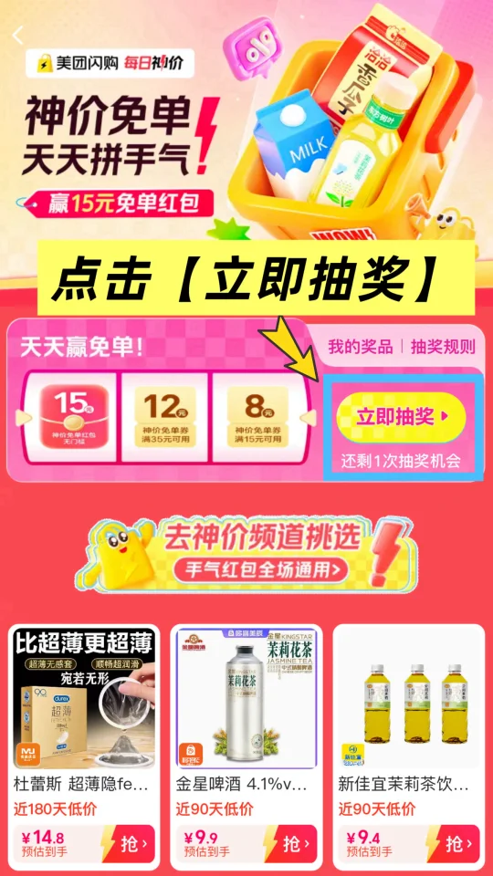 不仅有机会拼手气抽免单券,还有10款神价商品限时折扣!
