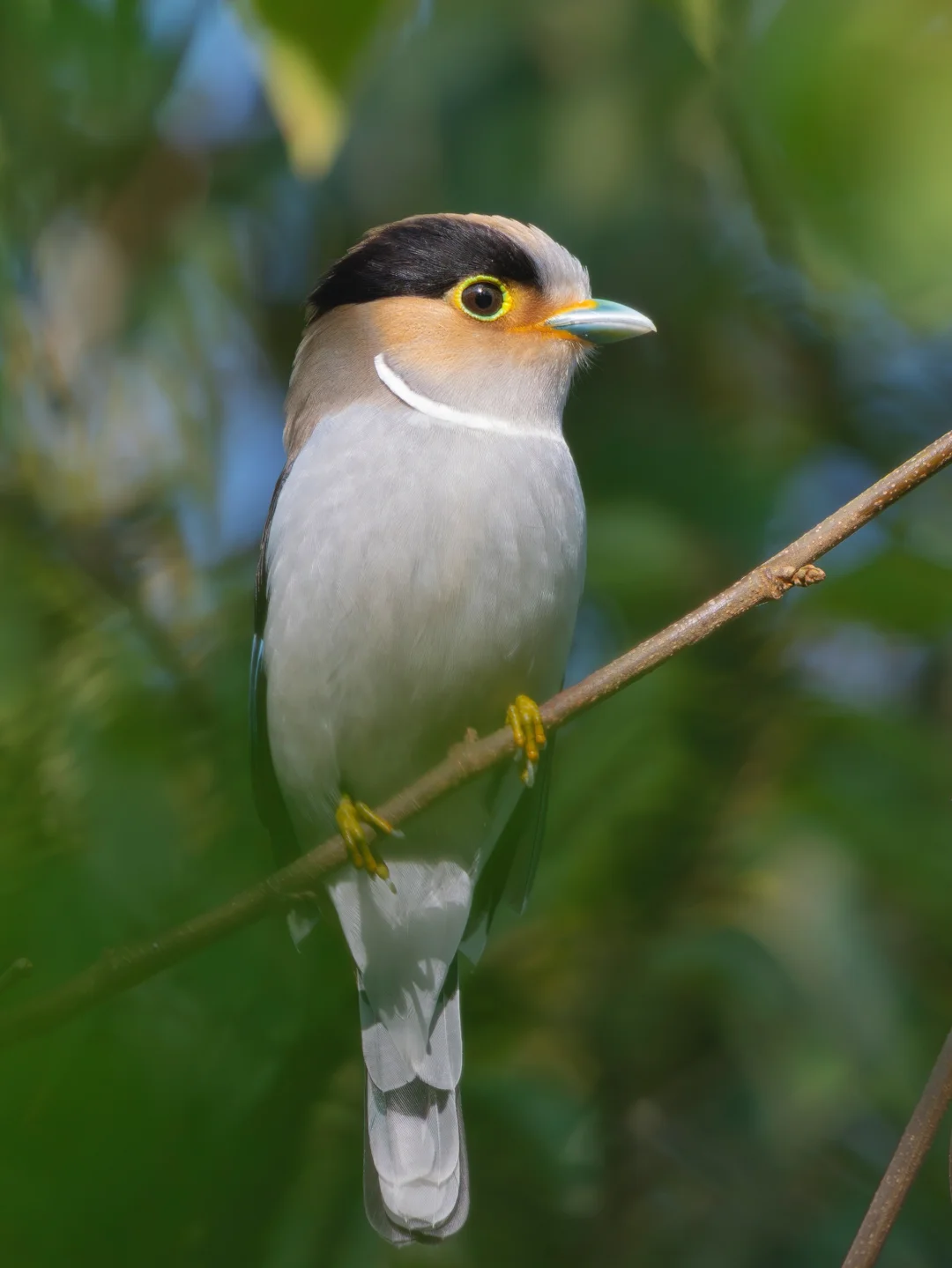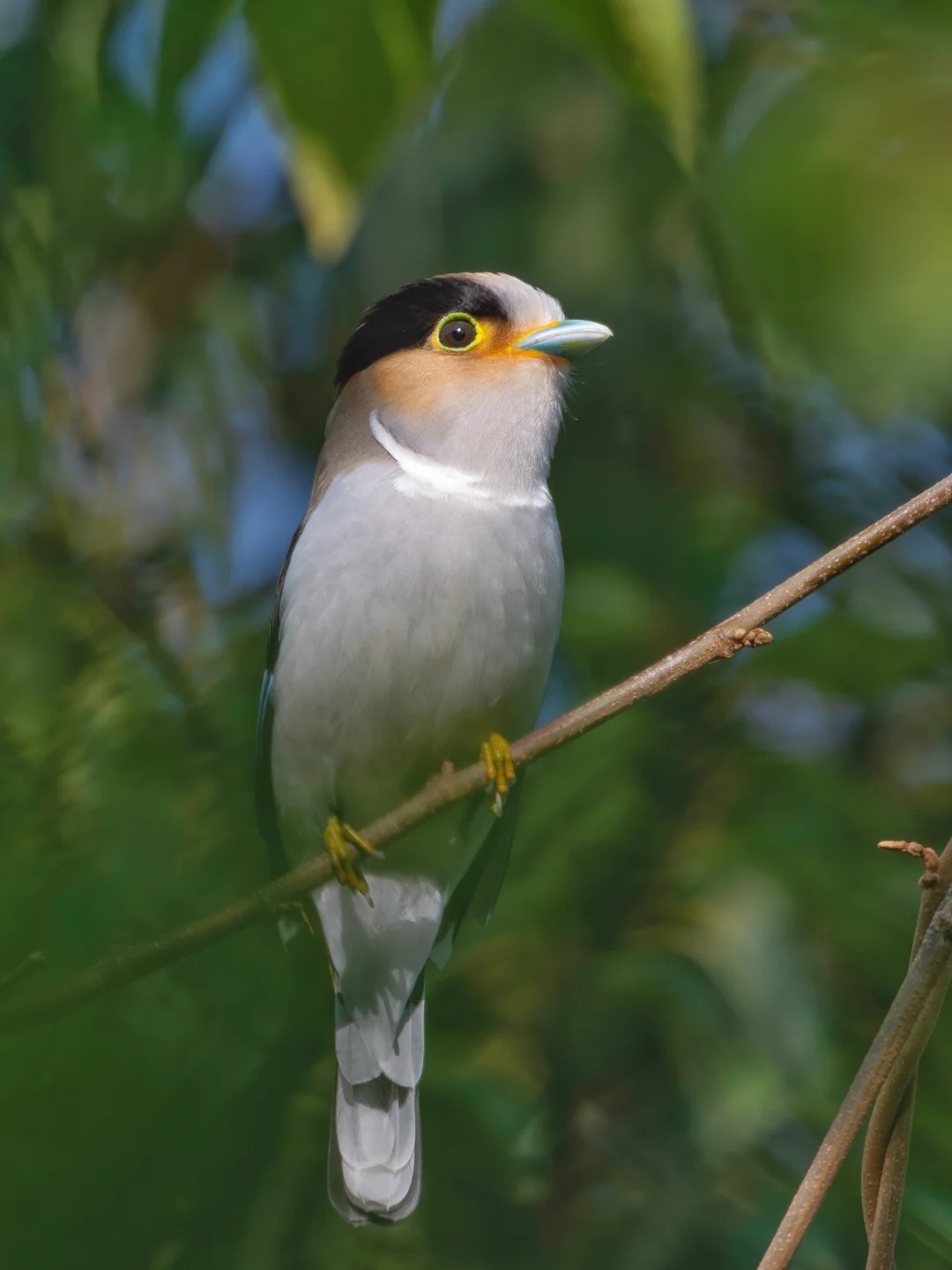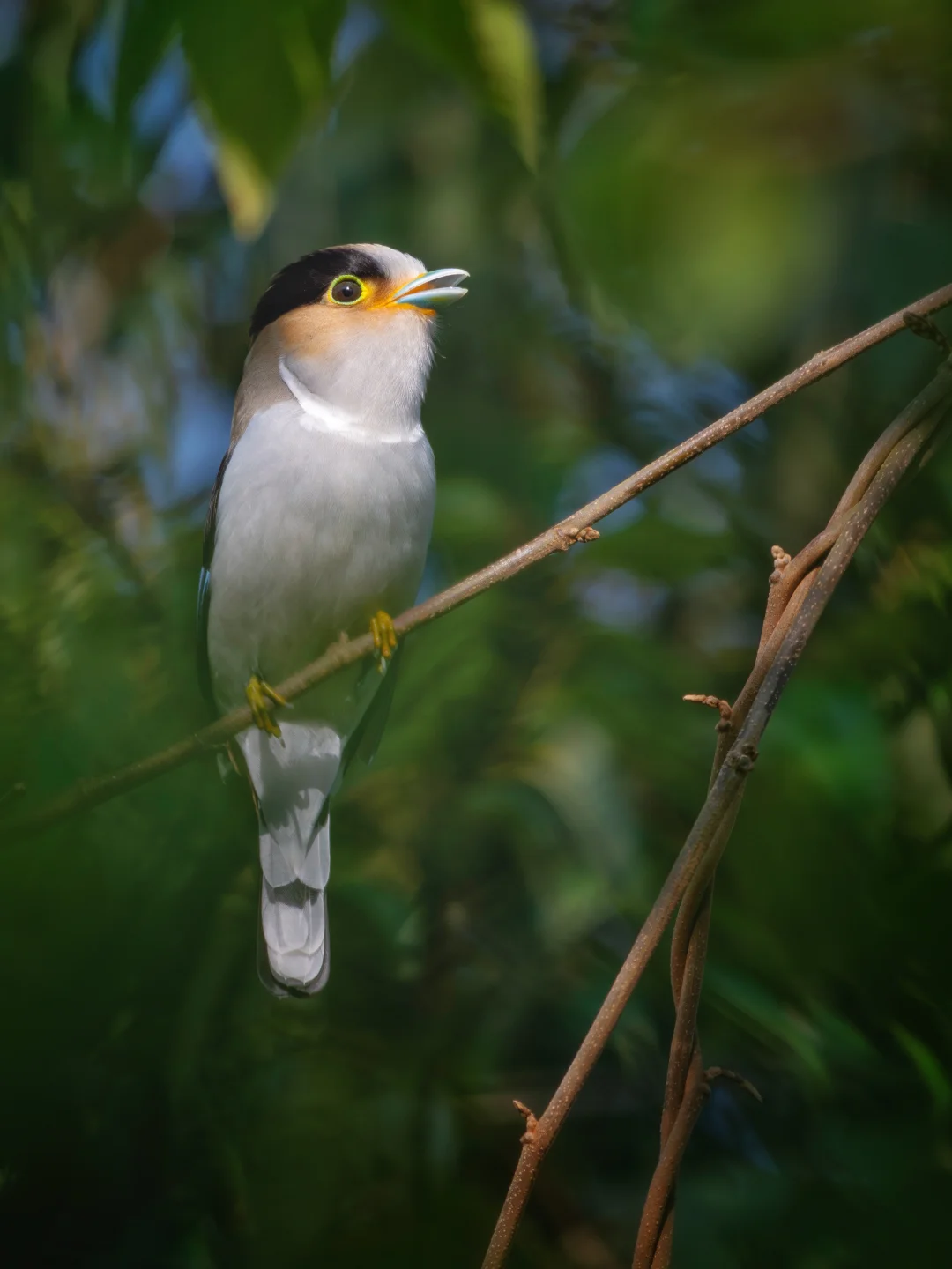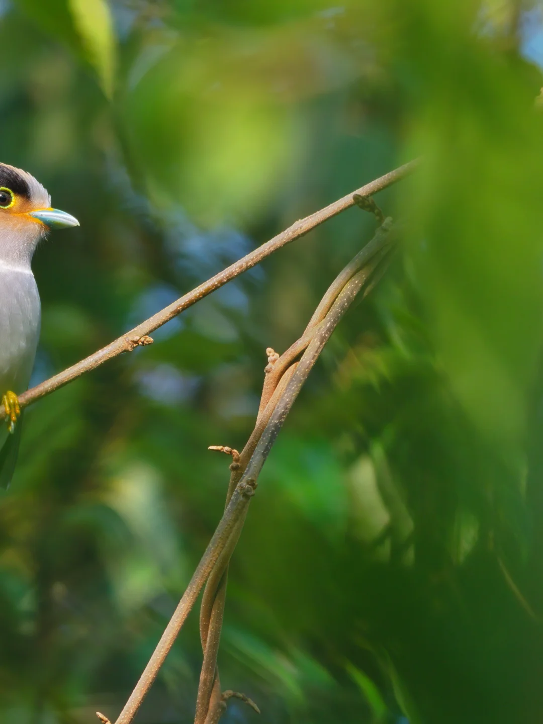 阔嘴鸟类的巢通常是一团悬挂在树枝上的“乱草的样子”,广西弄岗的长尾阔嘴鸟偏爱竹子和电线,沙巴的黑红阔嘴鸟偏爱河边的树梢。但银胸丝冠鸟的巢我至今还没有见过,我猜也是差不多类似的选址原则,这样筑巢有利于它们远离蛇之类的天敌来偷掠雏鸟。