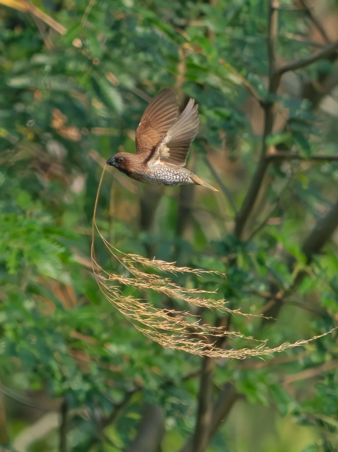立马我就举起了我的索尼480,通过800mm的超长焦距拍下了一组照片。放大一看,原来是一只正在用嘴衔着巢材的斑文鸟。