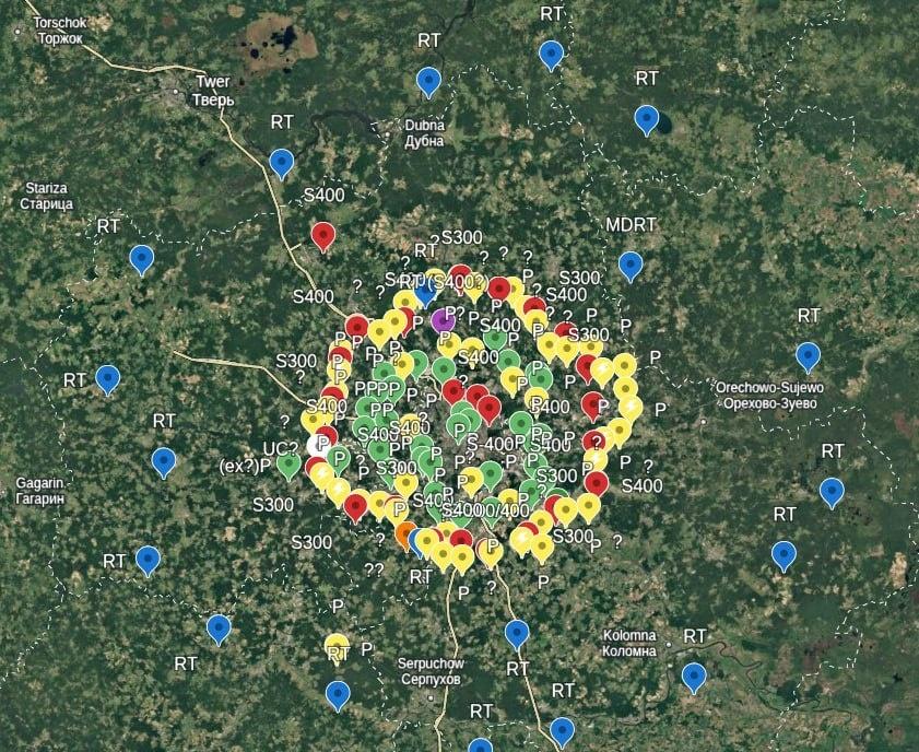 莫斯科的防空圈。 绿色的是铠甲S1防空塔,黄色的是常规防御工事,红色的是S-300/400阵地,蓝色的是雷达。 Фёдоров / Война История Оружие 俄乌局势新进展特朗普说是时候制裁俄罗斯了普京称若战斧袭击俄将强硬回应