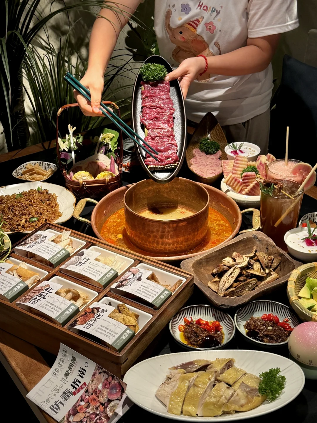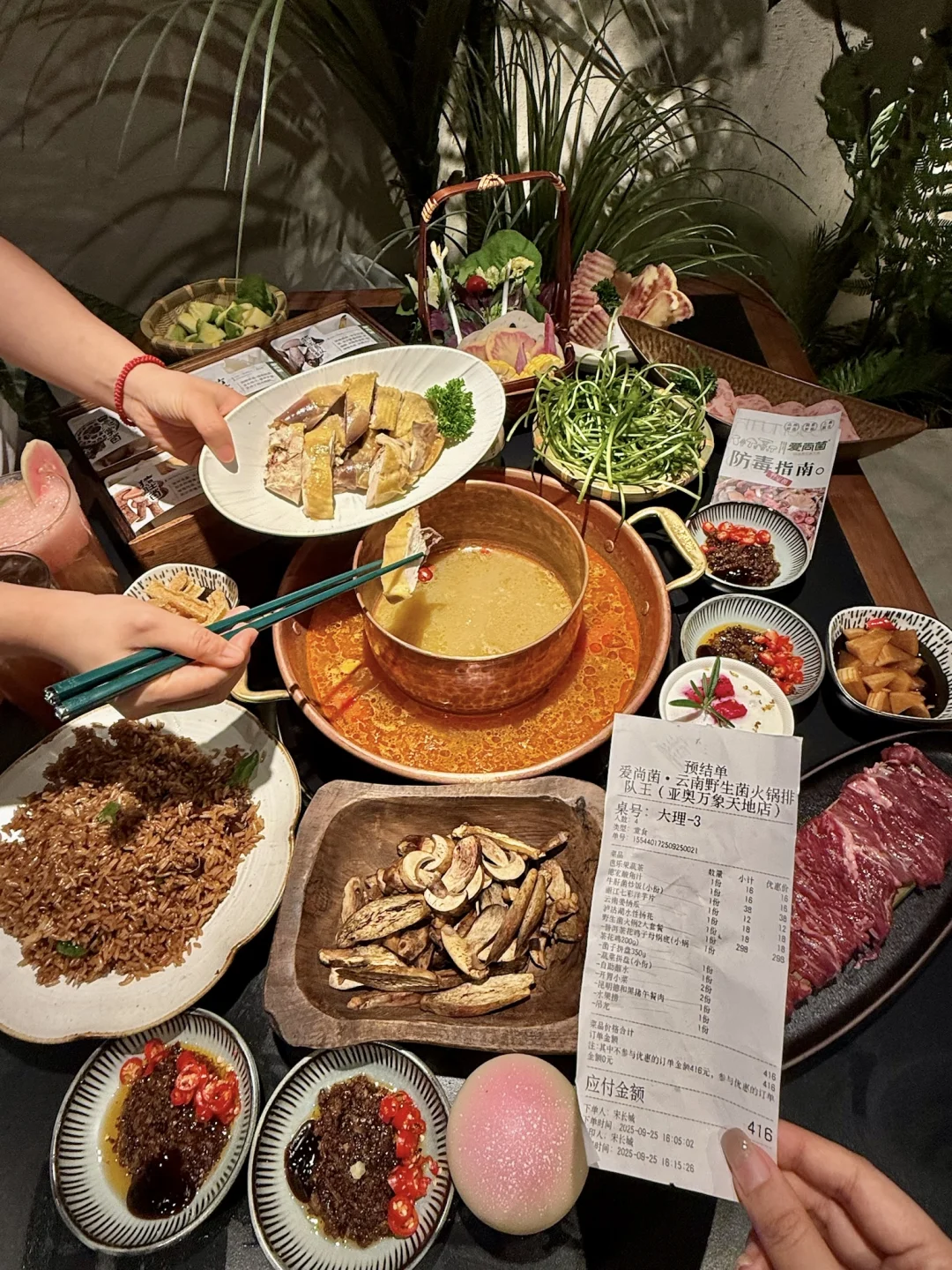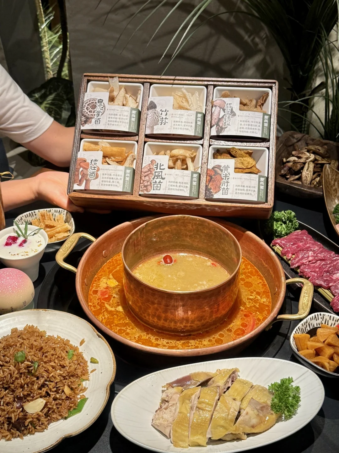 超爱这碗普洱茶花鸡锅底!菌子拼盘现煮,吸饱汤汁又脆又鲜😋傣味鸡丝酸辣够劲,牛肝菌炒饭拌匀嘎嘎香,蘑菇冰淇淋奶味chao浓,吃完顺路逛商场美滋滋! 氛围感火锅