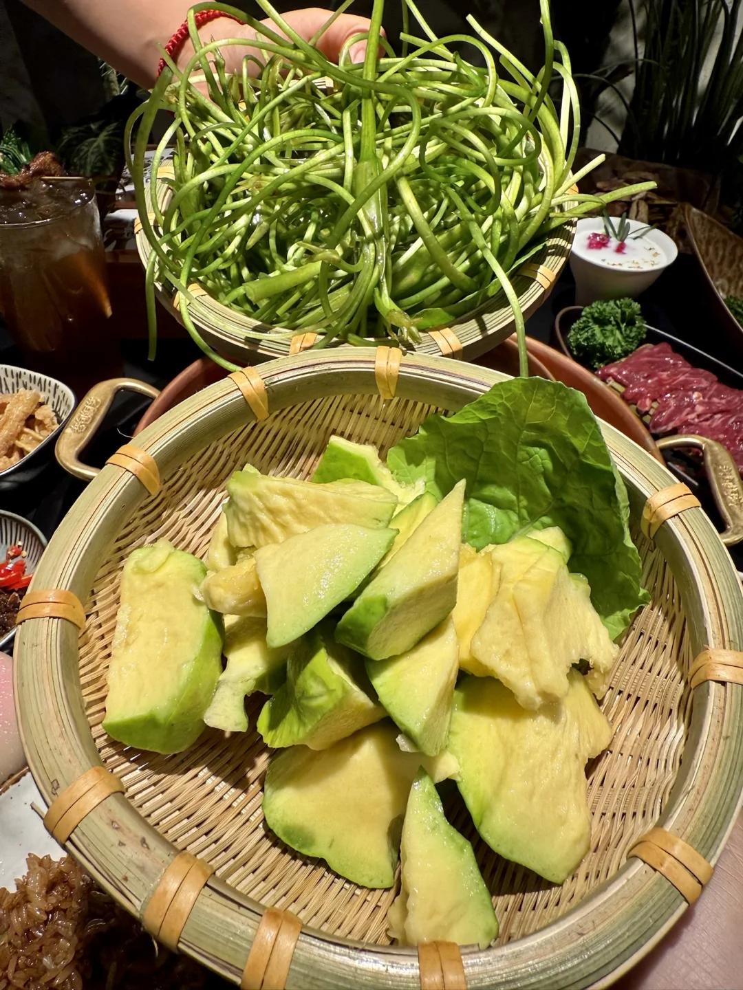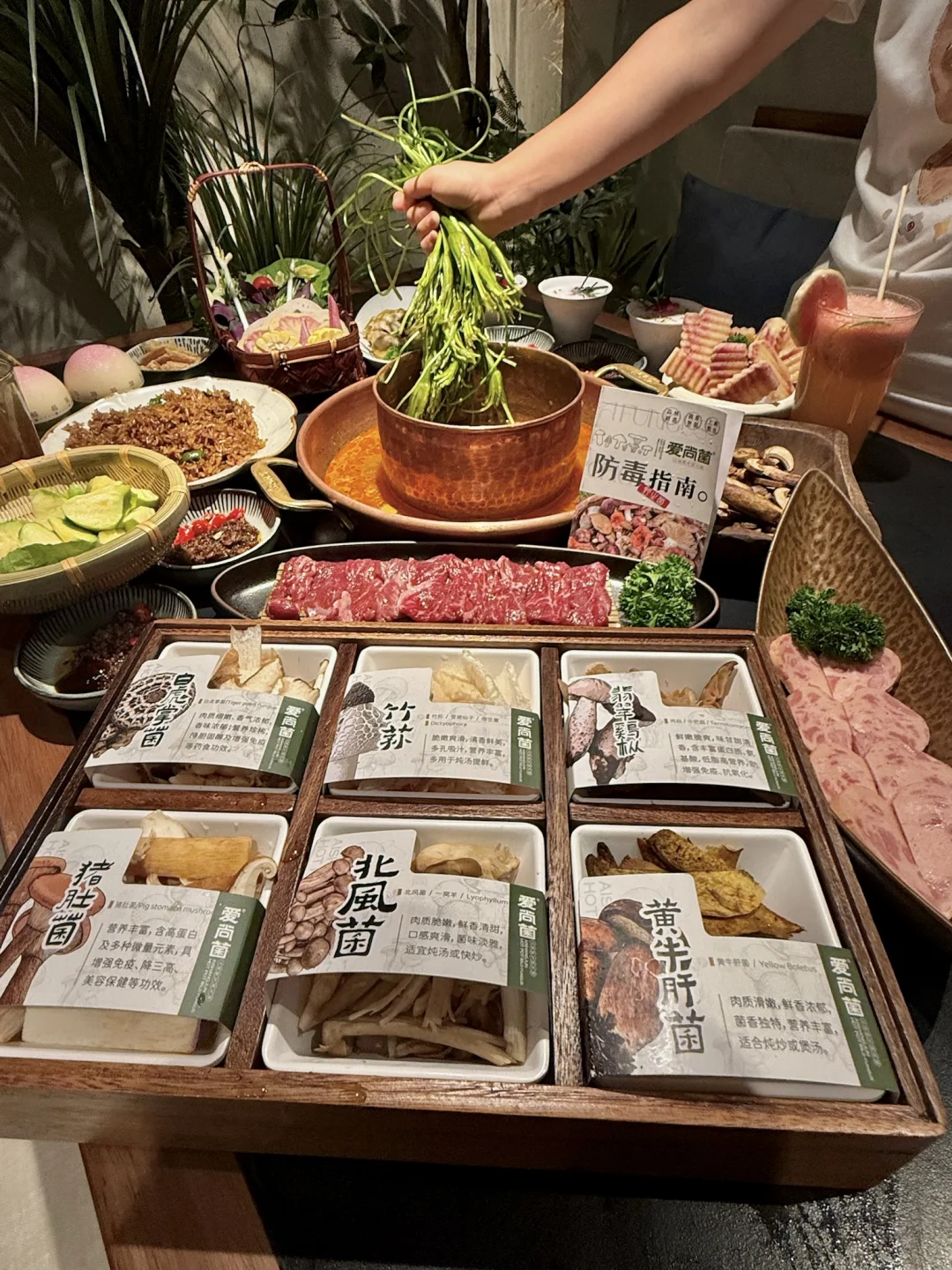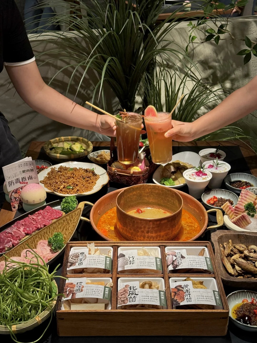 超爱这碗普洱茶花鸡锅底!菌子拼盘现煮,吸饱汤汁又脆又鲜😋傣味鸡丝酸辣够劲,牛肝菌炒饭拌匀嘎嘎香,蘑菇冰淇淋奶味chao浓,吃完顺路逛商场美滋滋! 氛围感火锅