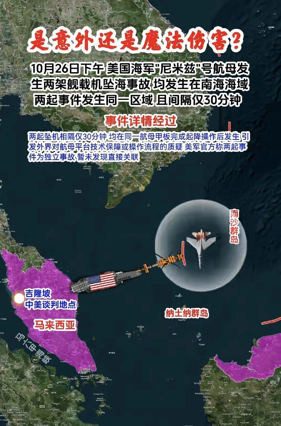 美军半小时掉两架飞机,说是意外,大家相信吗?一架算意外,两架算什么意外,如果这都算意外,那世贸大厦间隔很短时间被两架民航飞机相撞那也是意外了,现在的南海不是当年的南海,从今天开始的两架老美战机就算是献祭了,同时老美第一时间说没有人员伤亡,飞行员被捞了起来没只有天知道,不过,旁边有个国家阴阳他,说可以人道主义帮助,这信息量大啊,帮助什么,捞尸体还是……