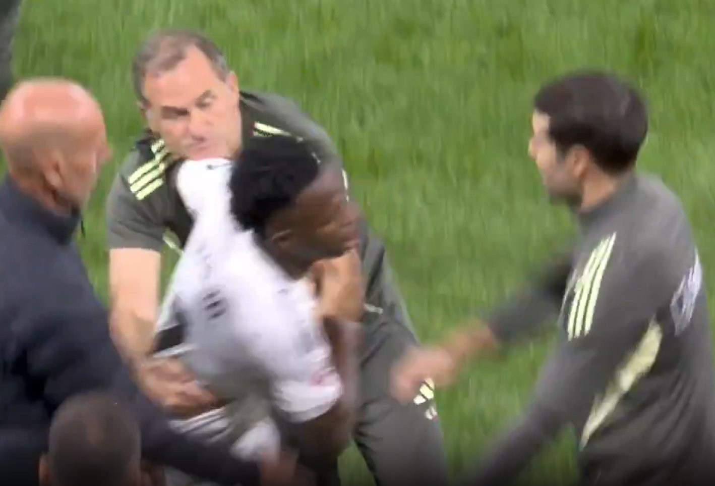 波及范围扩大:甚至连因伤缺阵、身着便装的拉菲尼亚也卷入其中。双方球员和教练纷纷加入,形成了一场多人参与的劝架与对峙。