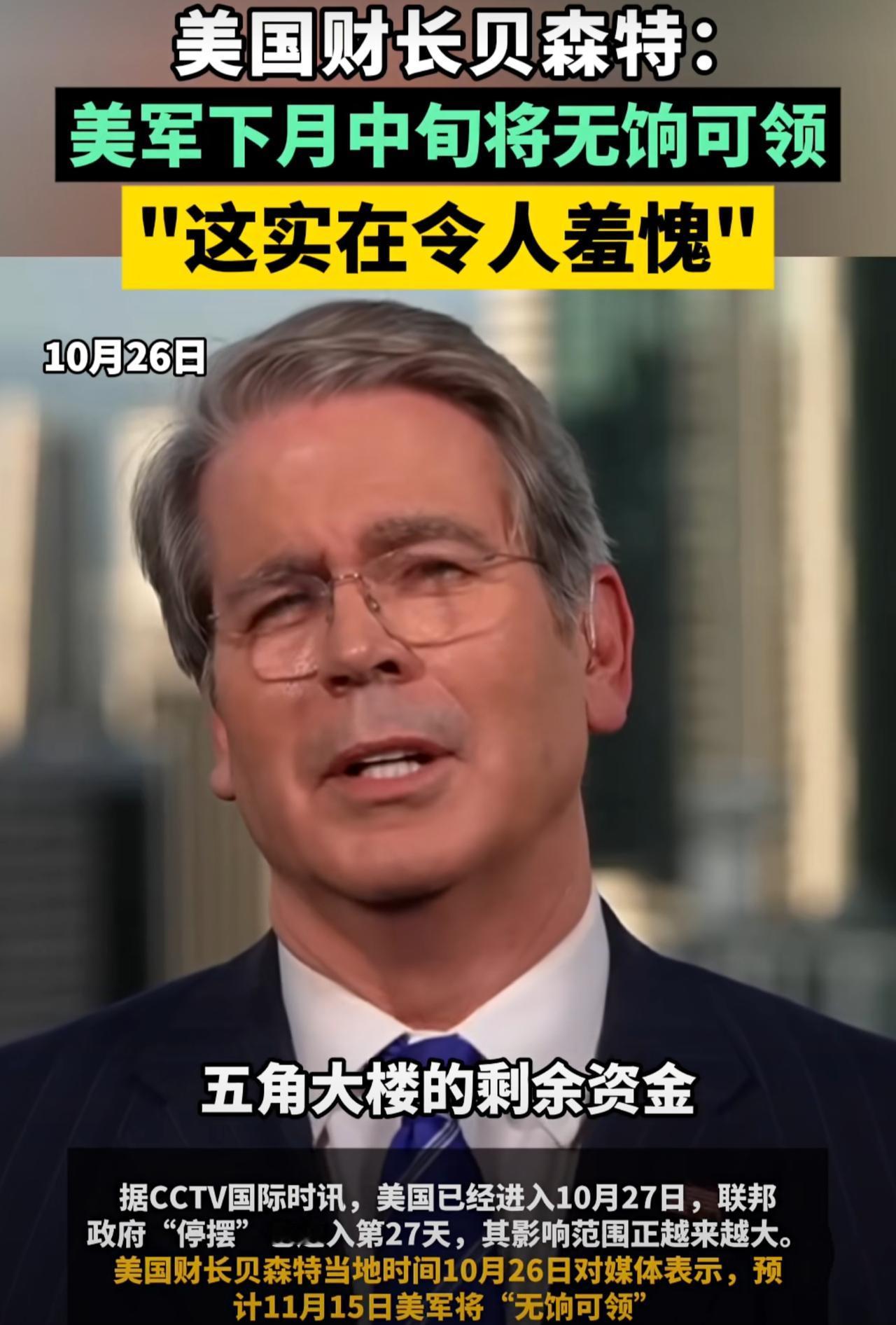 我说美国财政部长贝森特最近为什么着急上火,原来美军快断饷了。贝森特对媒体表示:“尽管我们本月中旬已动用五角大楼的剩余资金,向军人发放了薪水,但是到了11月15日,那些冒着生命危险服役的军人,将无法拿到薪水,这实在令人羞愧。”果然美国拿到了明末剧本,海军在南海摔了两架飞机,这是在闹饷吧?