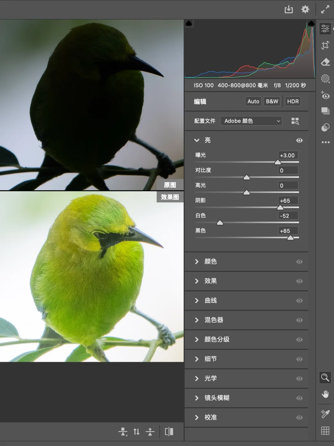但你也别慌!别着急把照片删掉!拖进camera raw里,没准儿就能挽救出一张还不错的小鸟美照[暗中观察R]