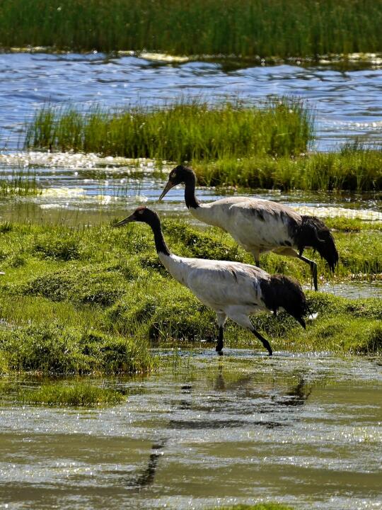 高原鸟类的繁殖期比平原地区来的更晚一些,通常从六月份开始。在八月份的青海,我曾经都见过正在育雏中的黑颈鹤。在这个时候,遇到的黑颈鹤通常两两结伴,或者一家三口或四口以家庭的形式出现。