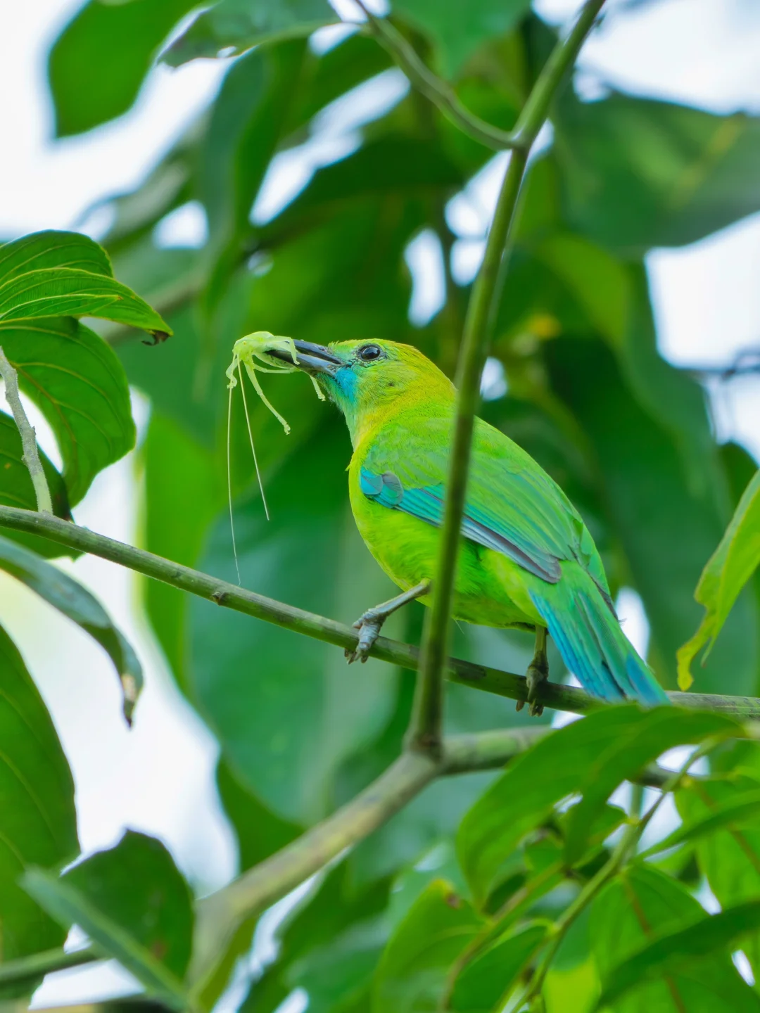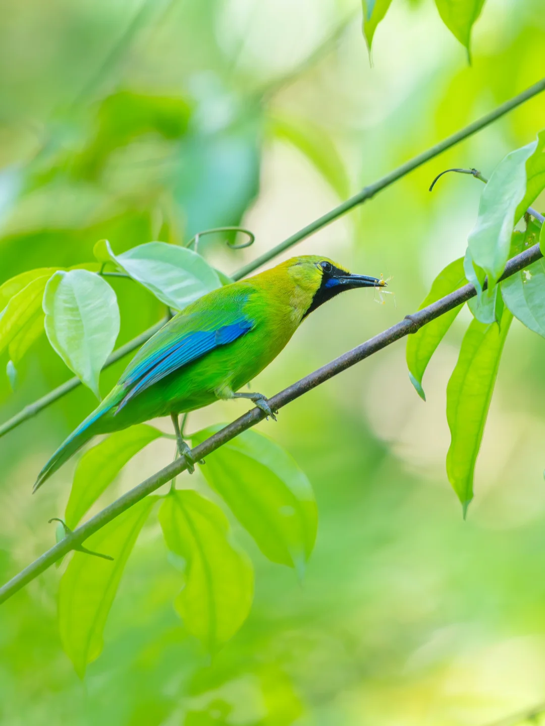 叶鹎的英文名直接叫leafbird,顾名思义,叶鹎几乎都是绿色系且喜欢在树冠层活动的鸟类。它们喜欢取食植物的花、果实、种子以及一些虫子,图中这只雄鸟抓了一个实在看不出是啥,雌鸟抓了一只螽斯。
