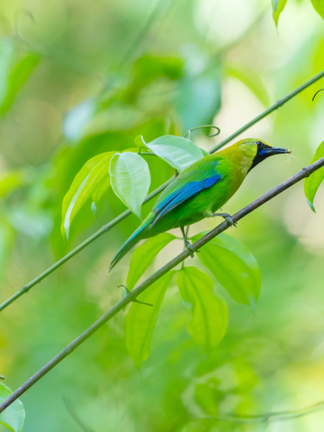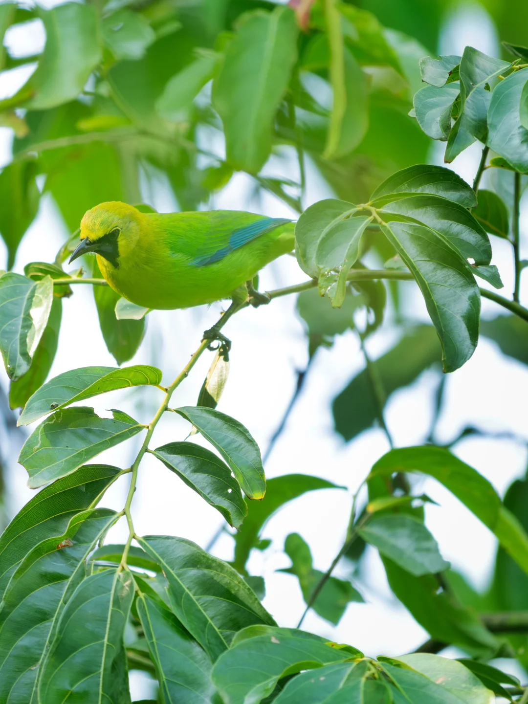 蓝翅叶鹎常常与其他鸟混群,比如雀鹎、山椒鸟之类的,但就是保护色太好,如果不注意听蓝翅叶鹎的鸣叫,就经常容易忽视它们的存在。