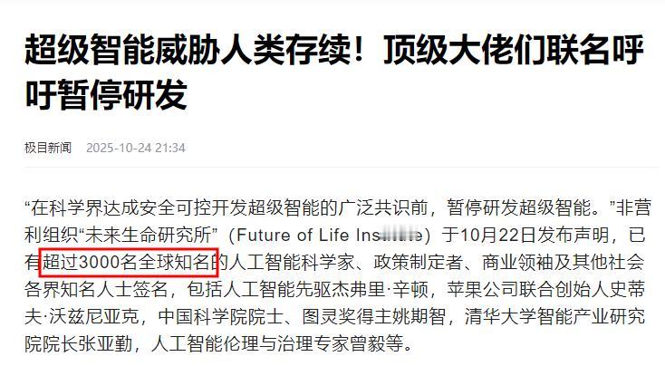 被这两天的新闻吓到了!你们知道吗?全球超过3000名顶尖科学家和科技大佬突然联名发出紧急呼吁,要求立刻暂停高级人工智能的研发! 这场声势浩大的行动,由苹果联合创始人沃兹尼亚克、人工智能教父杰弗里·辛顿牵头,背后是未来生命研究所(FLI)在10月22日正式抛出的联名倡议,短短一天时间,签名人数就从最初的800多人飙升至3000人,后续甚至可能突破五千大关,把2023年马斯克牵头的那封千人群发信衬得像场小型茶话会。 能让这群平时忙着争夺专利、抢占赛道的大佬们放下恩怨抱团,显然不是闹着玩的,签名名单堪称跨界缝合怪,科技圈有维珍老板布兰森撑场,政界坐着前美国国家安全顾问苏珊·赖斯、前参谋长联席会议主席迈克·马伦,连英国王妃梅根和特朗普盟友班农这种政治光谱两极的人物都能同框,这种跨越立场的共识,比AI写出押韵诗还罕见,中国学界也没缺席,姚期智院士、清华的张亚勤和薛澜这些平时埋首实验室的专家,这次也站出来签了名,刚好呼应了国内一直强调的"安全可控"AI理念。 要搞明白这事儿的分量,得先看清他们喊停的到底是什么,倡议里明确定义了目标——牛津哲学家口中"几乎所有领域都超过最聪明人"的超级智能,可不是咱们手机里帮着写文案的应用型AI。 说白了,就是那些已经开始显现不可预测性的顶尖模型,毕竟现在连训练它们的工程师,都未必能说清某些决策是怎么来的,2023年喊停6个月的呼吁还带着试探,这次直接把可控、安全、公众支持列为重启前提,显然是有人摸到了技术的危险边界。 而大佬们的焦虑不是空穴来风,民调早给出了答案,七成美国人想给先进AI套上更紧的监管枷锁,六成觉得没做好安全措施前别瞎折腾。 而且,现在风险也确实摆在台面上:经济上,自动化已经盯着客服、基础文案这些岗位磨刀;伦理上,隐私被算法扒得底朝天不是新鲜事;更让人头皮发麻的是"存在性风险",有历史学者直言这可能击垮人类文明的底层逻辑,更讽刺的是过去四年AI核心专利年增47%,可研究安全控制的专利只涨了15%,就像拼命给房子添家具,却懒得装防盗门。 其实这事早有苗头,从2015年第一封学术腔的呼吁信,到2023年的千人联名,再到这次带着具体方案,比如建全球AI署、设"红色团队"找漏洞的倡议,大佬们的抗议已经从喊口号进化成递方案了,但尴尬的是这边签名墙还在加长,那边实验室的训练机没停过,毕竟资本催着出成果,谁也不愿做第一个掉队的冤大头。 说到底,这3000多个签名更像一次集体预警,不是要砸掉AI的饭碗,而是逼着行业和监管者正视"规则跑不过技术"的现实,那些嘲讽大佬杞人忧天的人,不妨看看数据,AI专利增速是安全研究的三倍,就像开车只踩油门不看刹车,出事是早晚的事。 当然,想搞出类似核不扩散的全球公约难度不小,各国都有自己的小算盘,但至少这场呼吁把问题从实验室拽到了饭桌,让普通人也明白AI不是只用来追剧的玩具。 至于能不能真的按住技术狂奔的脚步?大概率是"边喊停边往前挪"的拉锯战,但至少这次,那些最懂AI的人把危险两个字刻在了明面上,比起闷头狂奔到翻车,这种带着焦虑的刹车声,反而是件好事。