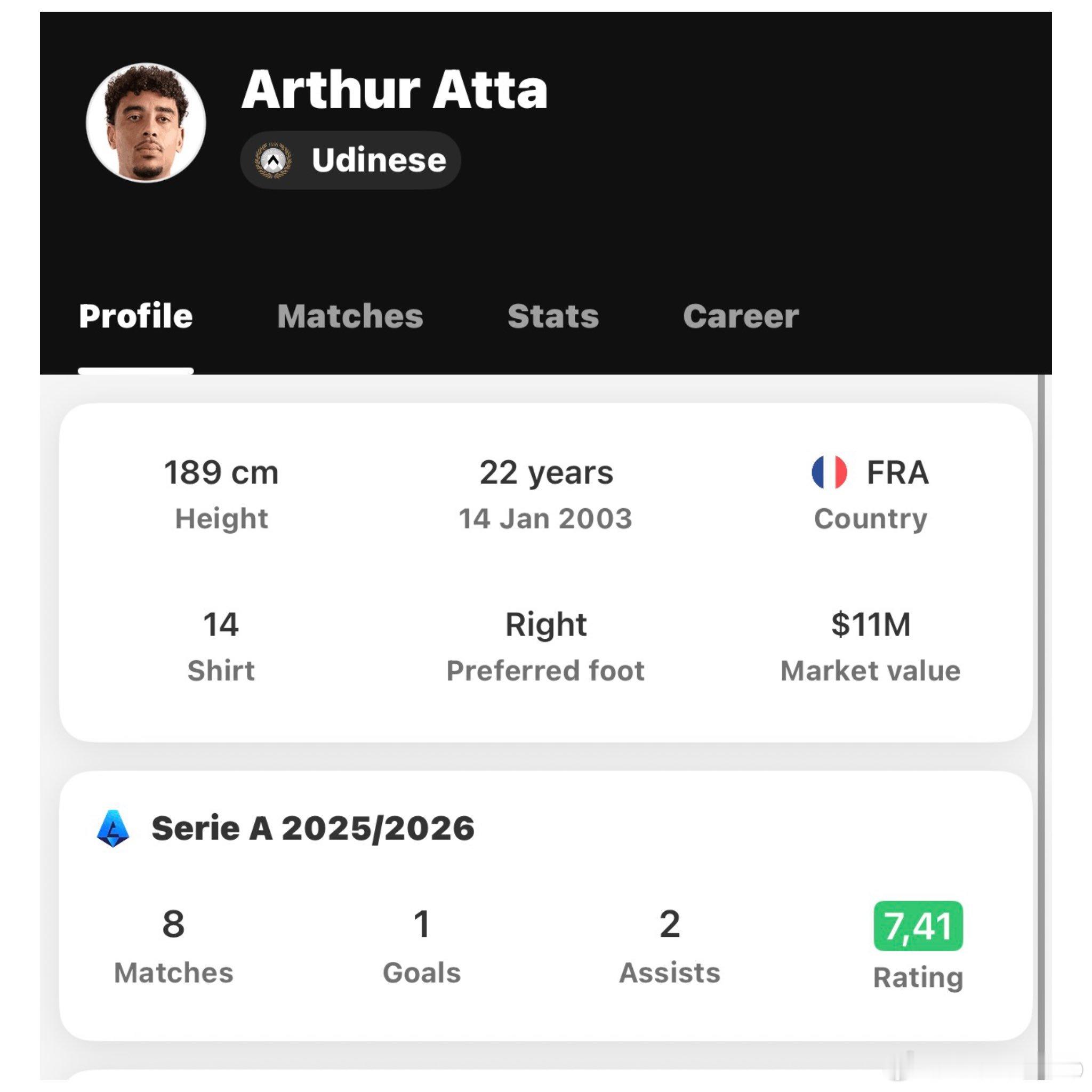 斯基拉:上周末,一名尤文图斯球探秘密出现在了乌迪内的蓝色能源体育场,他现场观看了乌迪内斯主场和莱切的意甲比赛,他的观察目标是乌迪内斯的大法超新星亚瑟王二世·阿塔(Arthur Atta),这位才华横溢的03年中场本赛季表现出色,球探已经将他的球探报告提交给了科莫利,科莫利将在下周三的时候现场观察。[偷笑]