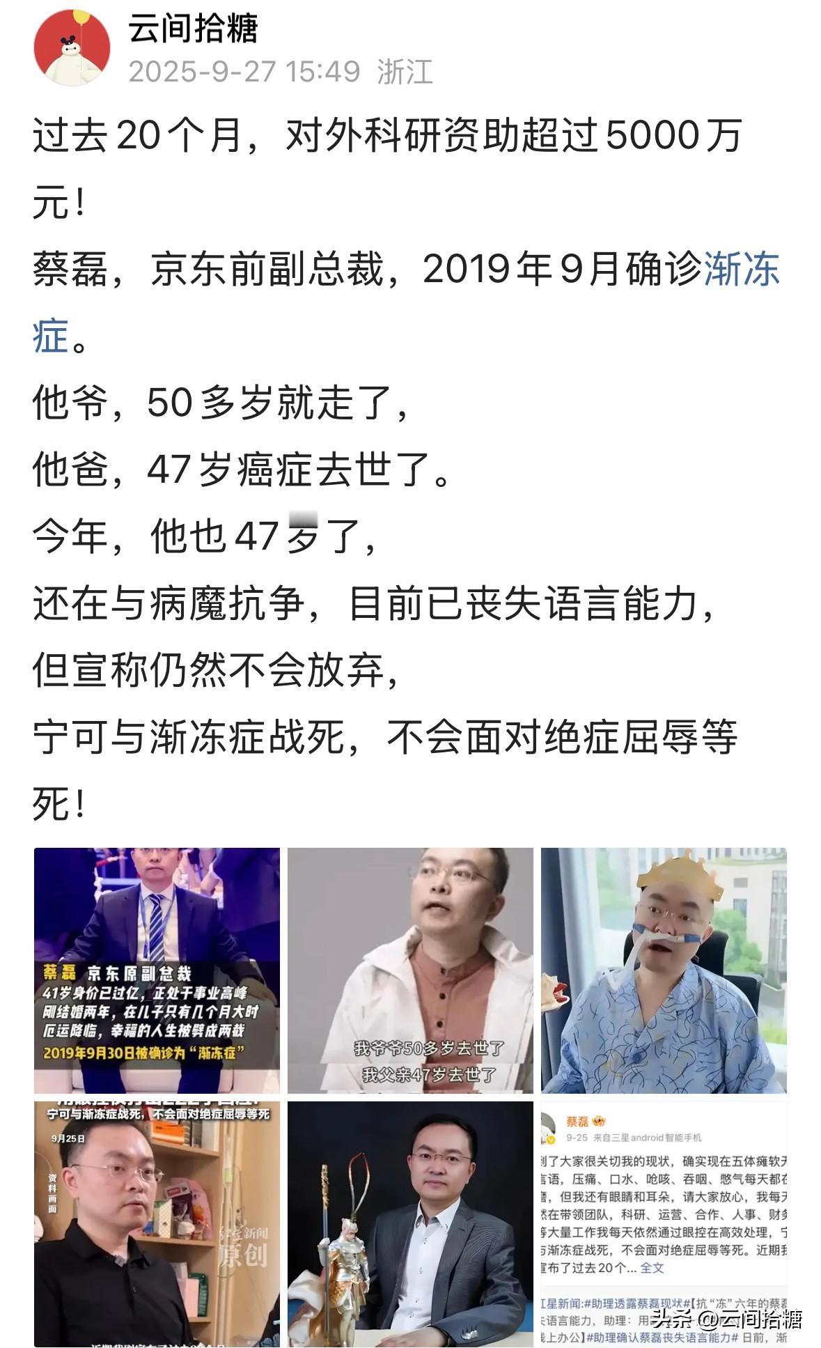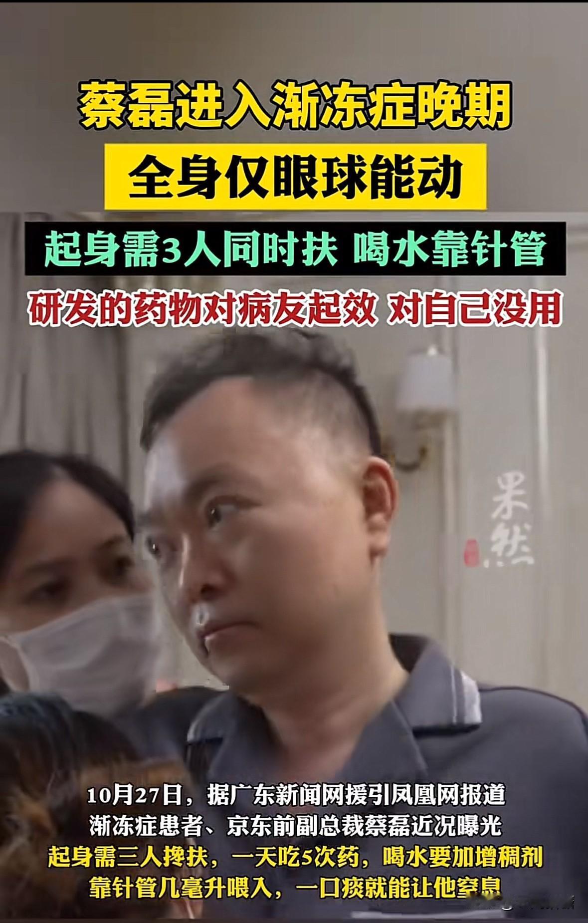 “每年的这个时候,他都出来了” 你相信这是网友对渐冻症患者蔡磊的评价吗? 据最新的报道称,蔡磊已进入渐冻症晚期,起身需要3个人搀扶,喝水靠针管。 一个月前,我刚写过一篇关于蔡磊对外科研资助超过5000万元,帮助很多渐冻症患者改善或延缓病情的文章。 这次采访,他无奈表示,研发的药物对病友起效,却对自己没用。 这是多深的绝望啊!他帮了那么多人,却帮不了自己,怎么还会有人冷嘲热讽。