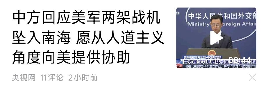 活该!美国两架军机在南海接连坠毁,外交部回应称:愿意从人道主义层面提供帮助,美方在南海炫耀武力正是这场悲剧的根源!按咱家乡土话讲,那就是“活该”!你没事跑南海来干啥呀,要是老老实实呆在家里,不就啥事都没了嘛,这纯粹是自讨苦吃。 对此你怎么看?