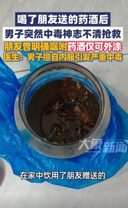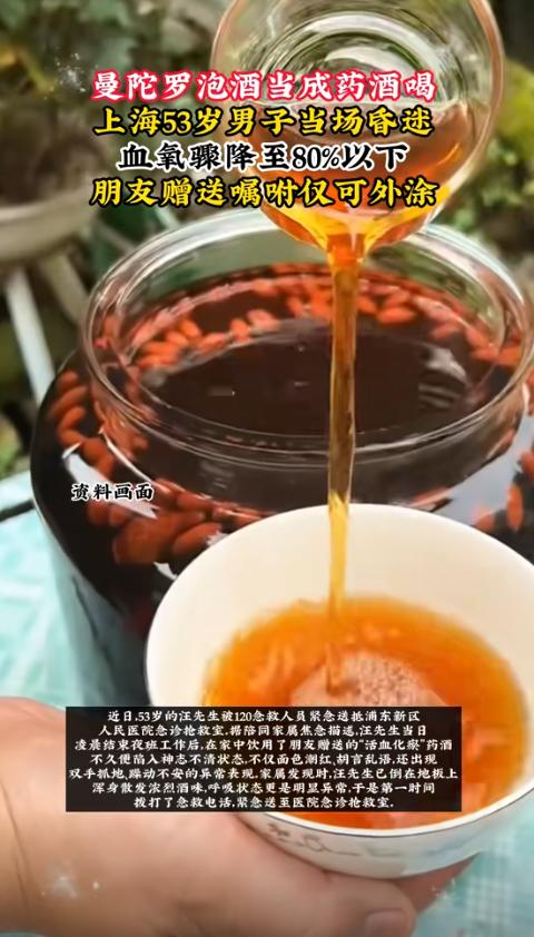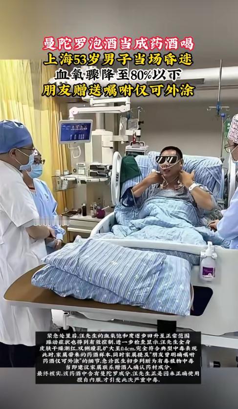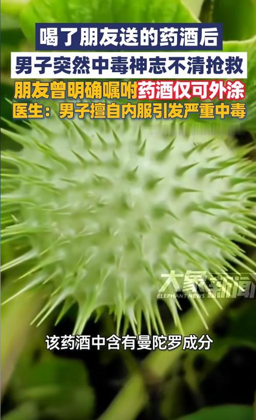 不是什么酒都能喝的,这下长记性了!10月23日报道,上海,一男子常年腰酸背痛,朋友便送来一瓶药酒,叮嘱他只能“外敷”,不能“内服”,不料,男子擅自饮用了药酒,很快就陷入神志不清状态,之后昏倒在地!家人发现后急忙将他送去医院。医生:曼陀罗中毒! 10月23日大象新闻报道,上海53岁的汪先生常年腰酸背痛,后来一位朋友送了他一瓶外服的药酒,说可以缓解腰酸背痛,汪先生用了几次还挺有效果,就把药酒放在家里哪疼了就用药酒擦擦。 可就在最近的一天,汪先生刚下夜班回到家感觉浑身疲惫,他想起朋友前些天送来的药酒,想着敷到身上能活血化瘀,喝点的话是不是还可以缓解疲劳呢,他就倒了点喝下去,朋友当时确实叮嘱过只能外用,可汪先生压根没往心里去。 这一喝可坏了事,没过多久汪先生就开始不对劲了,先是觉得眼前模糊身上发热,接着开始说胡话整个人躁动不安,家人听到动静赶出来一看,汪先生已经倒在地上,双手乱抓脸涨得通红瞳孔都散大了,家人赶紧拨打了120急救电话。 120救护车火速赶到,医护人员一测血氧饱和度,直接掉到80%以下,这个数值相当危险,意味着身体严重缺氧,随时可能呼吸衰竭。 急诊室里医生们忙成一团,先给汪先生用镇静剂控制躁动,紧接着插管上呼吸机,还得防着他呕吐物呛进气管引发窒息,看着监护仪上忽高忽低的数值,医护人员的心都提到嗓子眼。 经验丰富的急诊医生看到汪先生皮肤潮红、瞳孔散大的症状,心里有了判断,这很可能是植物中毒,家属这才想起带上那瓶药酒,还说朋友特意交代过千万别喝只能外涂。 化验结果证实了医生的判断:曼陀罗中毒,原来这瓶药酒里含有曼陀罗成分,其中的东莨菪碱毒性极强,外用确实能缓解跌打损伤,可一旦内服哪怕只是几口都可能致命。 接下来的抢救更是争分夺秒,洗胃、导泻、解毒,医护人员轮番上阵,汪先生在ICU里躺了整整5天,期间家人守在病房外心急如焚,好在抢救及时汪先生最终脱离危险,康复出院时他心有余悸地说:这辈子再也不敢乱喝药酒了。 说起曼陀罗很多人可能不太了解,这种植物在野外很常见,开着喇叭状的花朵,看起来挺漂亮,但它全株有毒尤其是种子和叶子,含有多种生物碱,中医确实会用它入药,但必须经过严格炮制,而且主要用于外敷。 曼陀罗中毒的症状来得特别快,轻的会出现口干、面红、瞳孔散大,重的会神志不清、幻觉、抽搐,最严重的会呼吸麻痹致死。 北京就曾有位老人为了治腰椎间盘突出,自己用曼陀罗泡酒内服,结果昏迷了3天,在ICU抢救半个月才脱险,医药费花了好几万。 类似的悲剧其实不少见,很多人迷信偏方治大病,觉得药酒既然能外用,喝点应该效果更好,还有人分不清外用内服的区别,看到是药酒就往肚里灌,殊不知,外用药酒里经常添加曼陀罗、乌头、马钱子等剧毒药材,这些成分透过皮肤吸收量有限,但直接进入消化道就是另一回事了。 医生特别提醒如果不慎误服了外用药酒,千万别自己抠喉咙催吐,这样反而可能造成二次伤害,正确做法是立即拨打120,保留好药酒样本,告诉医生喝了什么、喝了多少、什么时候喝的,时间就是生命,越早治疗预后越好。 现在市面上各种药酒五花八门,有些是正规药厂生产的,有些是民间偏方自制的,购买使用前一定要看清说明书,分清内服还是外用,即便是内服药酒也要遵医嘱不能想喝就喝。 麻烦看官老爷们右上角点击一下“关注”,既方便您进行讨论和分享,又能给您带来不一样的参与感,感谢您的支持!