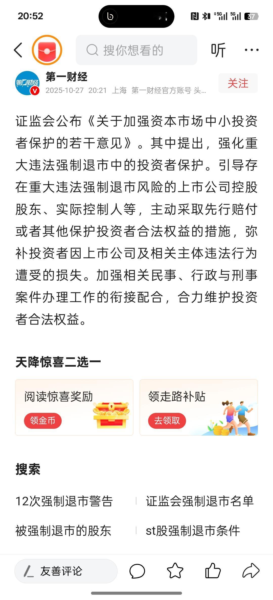重大利好消息,接下来,对于重大违规强制退市的上市公司,要实行先行赔付或者其他保护投资的合法权益措施,证监会:引导存在重大违法强制退市风险的上市公司控股股东、实际控制人等,主动采取先行赔付或者其他保护投资者合法权益的措施 就应该这样先行赔付投资者的损失。对于这些欺诈重大违规的上市公司,就应该对实控人采取这样的措施,以免这些人老想为自己谋利! 只有把这些责任压实过后,这些人才不敢欺诈发行,不敢违规违法造假,这些人身上没有担子,没有责任,他就不会感到害怕