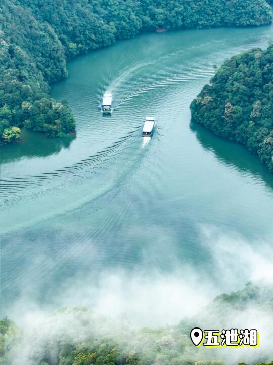 进景区后,乘坐扶梯上到码头,坐游船穿过五泄湖