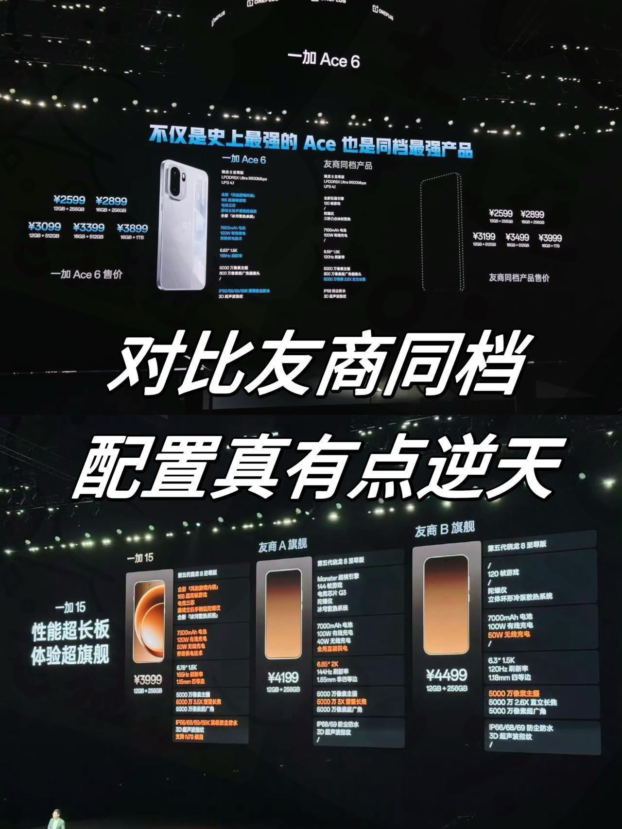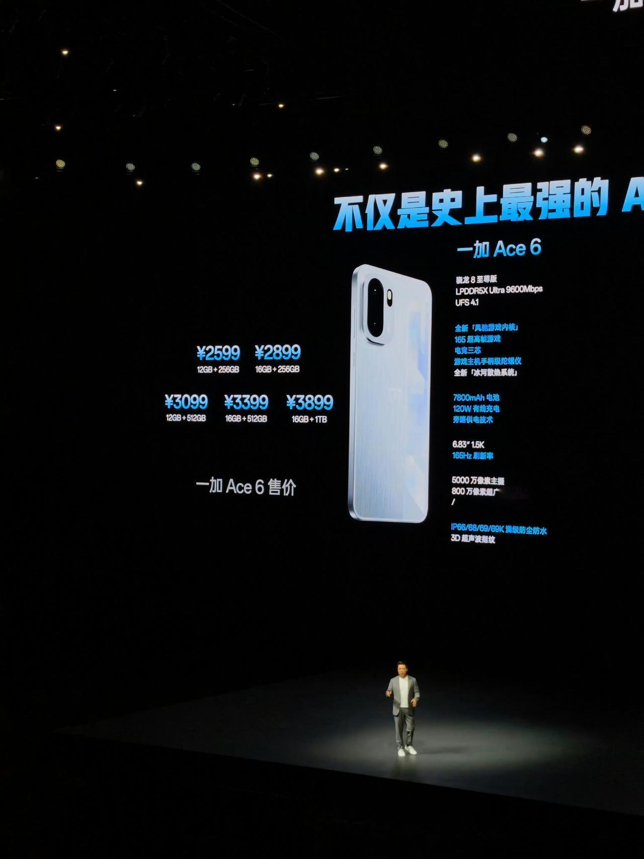 [捂脸]看完一加发布会,是我唐突了,2599起步!165Hz屏幕独挡存在,香麻了! 一加Ace6, 12+256——2599 16+256—— 2899 12+512——3099 16+512——3399 16+1TB ——3899 配色:快银 / 闪白 / 竞黑 📌 核心: - 骁龙8Elite丨G2电竞网络芯片 -LPDDR5X内存丨UFS4.1闪存 -双电芯7800mAh+120W快充丨44W UFCS丨55W PPS -6.83英寸 OLED 1.5K直屏丨165Hz丨全局峰值亮度1800nit 📌 影像: - 50MP IMX906 OIS F1.8 主摄 - 8MP 超广角 - 前置 16MP 📌其它: - 超声波屏下指纹识别方案丨X轴马达|NFC|红外遥控 - 支持IP66 / 68 / 69 / 69K 防尘抗水 说实话,作为两千元档的中端机,有取舍很正常,影像主摄够用就行。当然了,长板也很明显,骁龙8Elite+「风驰游戏内核」,游戏性能本来就很不错了,再加上165Hz原生的屏幕,这简直就是2K档的游戏体验“屠夫”[捂脸] 当然了,机身轻薄的同时,又塞了7800mAh的大电池+120W快充,而且还是双电芯的,可以说就是给打游戏的准备的,发热量低,充电速度快。 怎么说呢,一加特别懂用户想要什么,金属中框+AG玻璃保证家族一致性质感;超声波指纹、湿水触控保证好用;而那么多的防尘防水认证也是对标旗舰机。我只能说两千多还要啥自行车?144Hz屏幕想体验就得4000块,而一加只用两千五,打游戏的有福啦!
