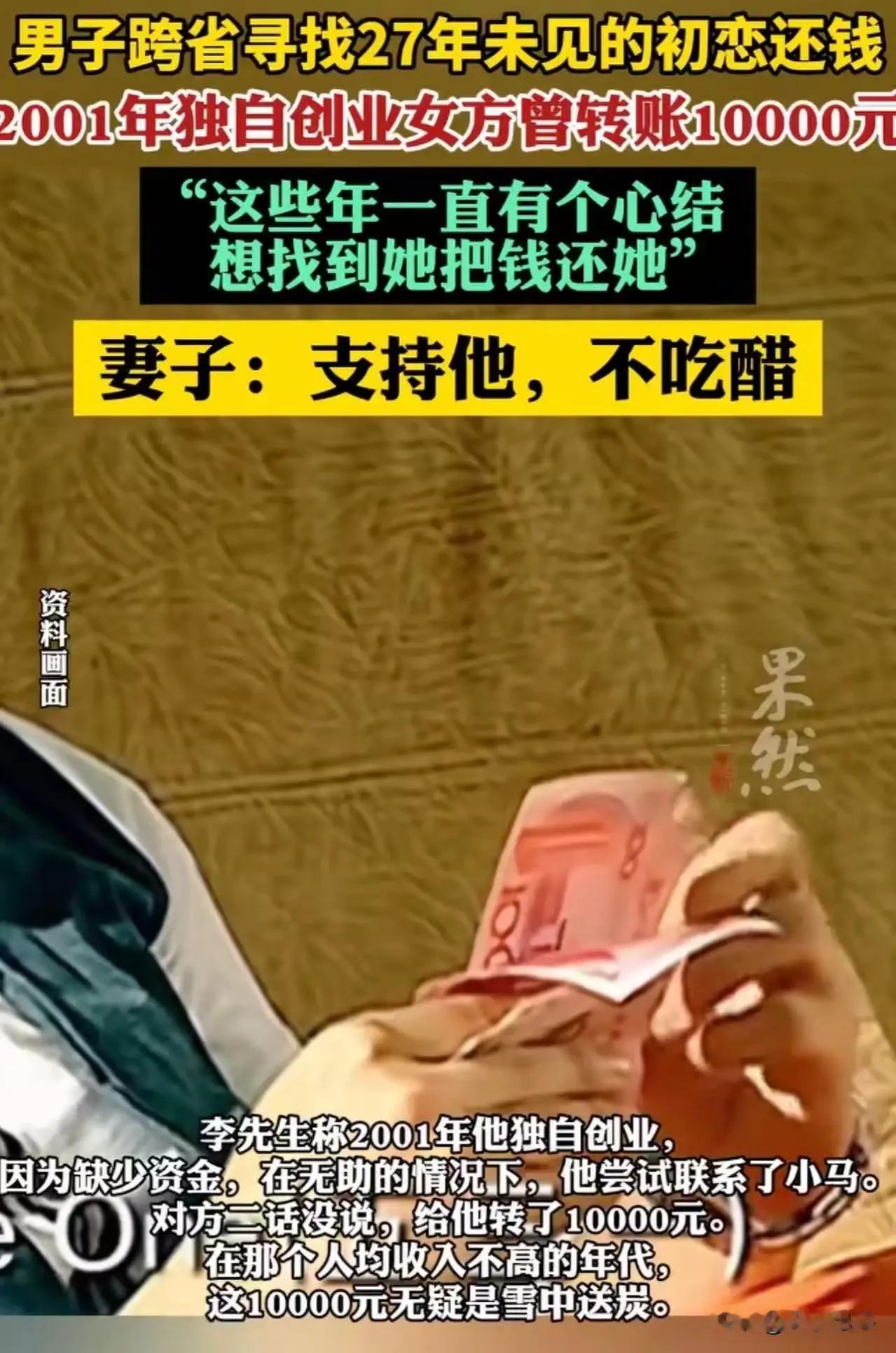 跨省寻初恋还1万欠款:27年的心结,藏着成年人最难得的真诚 “27年了,终于能把这钱还回去了。”当山东男子跨越千里,找到那位27年未见的初恋时,这句话里没有暧昧,只有卸下重担的坦然。1997年,他独自创业陷入困境,是初恋二话不说转来1万元;如今生活安稳,这份当年的“救命钱”,成了他心里揣了近三十年的牵挂。 27年前的1万元是什么概念?是普通人一年多的工资,是能撑起一个小家的积蓄,更是毫无保留的信任。那时没有借条,没有约定,只凭一份纯粹的情谊,她把钱借给了正在打拼的少年。而他,记了整整27年——不是记着“情”,而是记着“恩”。 最让人动容的,还有他妻子的态度。当丈夫说要跨省找初恋还钱时,她没有猜忌,反而全力支持:“该还,这是良心债。”没有狗血的“吃醋”戏码,只有夫妻间的理解与通透。在满是“前任即敌人”的狗血剧情里,这份清醒,更显珍贵。 网友吵翻了天:有人说“分明是想见她,还钱只是借口”,也有人算着“27年利息得还10万”。可比起这些猜测,更该看见的,是成年人世界里快要稀缺的“真诚”——他没借着时间模糊承诺,没因为对方是“前任”就淡化恩情;她当年敢倾囊相助,如今也坦然收下还款,没有矫情的推托。 其实这哪是什么“旧情难忘”,分明是两个人用27年,守住了人与人之间最朴素的信义。就像他说的:“不还这笔钱,我心里永远有个结。”这份“拎得清”,比任何浪漫都动人。如果是你,27年前的一份恩情,会记到现在吗?评论区说说你的故事! 需要我基于这个事件,再提炼一个“成年人的信义与边界”相关的观点短文,进一步引发读者对“感恩”和“情感边界”的讨论吗?