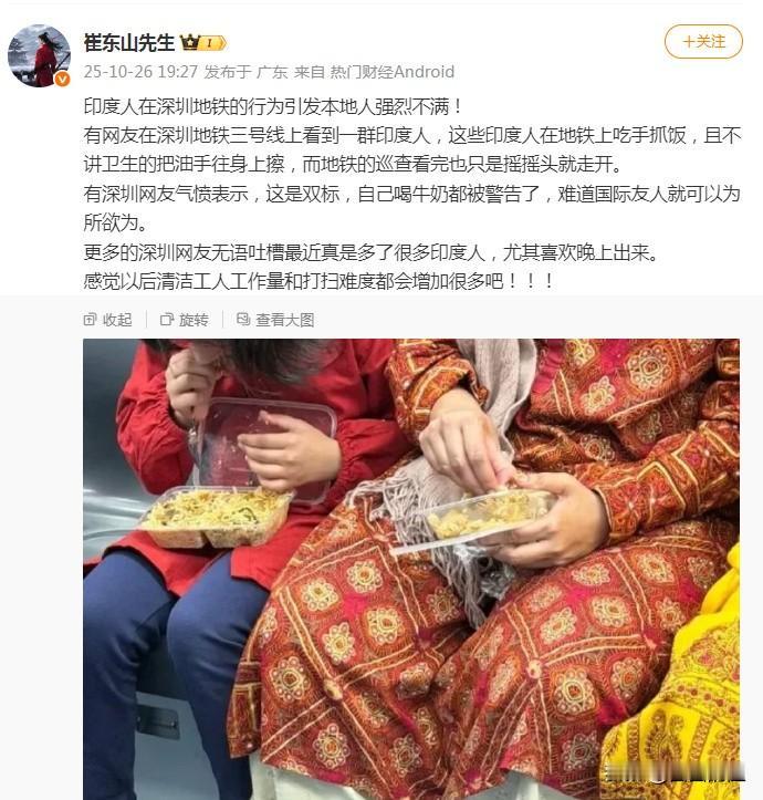 好家伙,深圳地铁车厢里,一群印度人竟然淡定吃起了手抓饭!咖喱味飘满车厢,旁边乘客都懵了。 有人拍下发上网,瞬间炸锅:“地铁不是不让吃东西吗?” 深圳地铁火速回应:是的!规定写得明明白白,车厢里除了小宝宝,一律禁止饮食。这些人的行为,确实违规了! 他们已经登记这事儿。规矩遇上习惯,这事儿你怎么看?