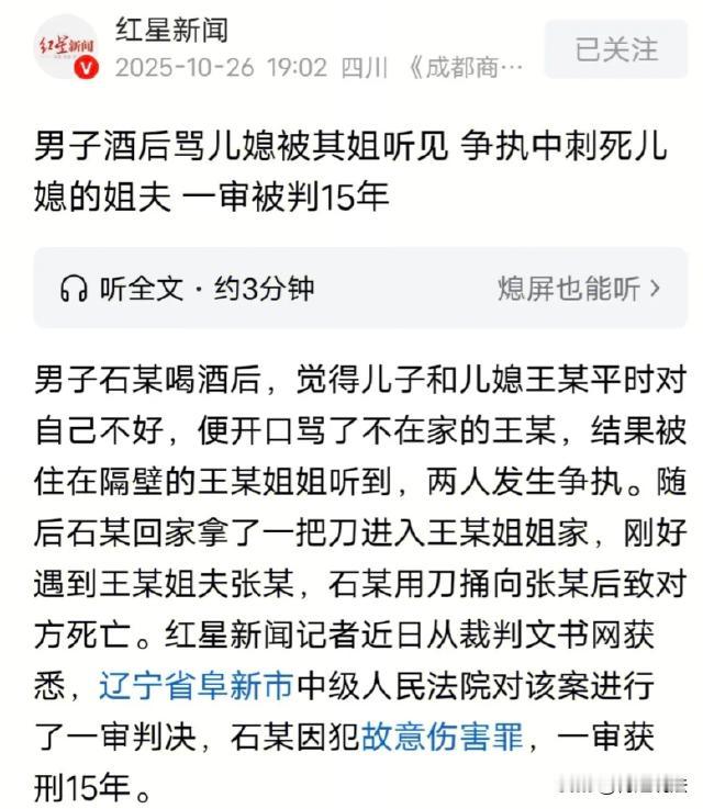 辽宁阜新,石某酒后觉得儿子和儿媳对自己不好,在门口辱骂儿媳,不成想,竟被住隔壁的儿媳姐姐听到,双方发生争执。石某回家拿了凶器,就去了儿媳的姐姐门,碰上儿媳的姐夫张某,两人起了争执,石某拿刀捅 死了张某,事后他也害怕了,给女儿发了语音后,骑上三轮车出门时,被民警控制,最终这样判了他! 这事,还得从当天石某在家一个人,喝了七八两白酒说起,醉得东倒西歪,酒劲上头后,他开始耍酒疯,觉得儿子儿媳对自己不孝顺,跑到大门口,扯着嗓子骂儿媳。 隔壁住着儿媳的姐姐,听到石某的辱骂声,实在忍不下去,就出来和石某理论,想让他别再闹了。 可石某借着酒劲,不肯罢休,和儿媳的姐姐吵了起来,越吵越凶,情绪越来越激动。 争执中,石某突然跑回家,拿了一把镐头和一把尖刀,直接去了儿媳的姐姐家。 这时,儿媳的姐夫,张某刚好回家,石某看到张某,以为他要和自己打架,直接掏出尖刀,朝着张某左侧的腹部,就捅了过去。 张某毫无防备,被这一刀,捅倒在地,尽管事后紧急送往救治,但还是没能挽回悲剧的发生,不幸离世。 等酒劲过去,石某也清醒了,看到眼前的一切,也是吓得浑身哆嗦,知道自己闯祸了,害怕得不行。 他给女儿发了语音,说自己捅人的事,然后骑上三轮车,打算出去躲躲,可没走多远,就被民警控制住了。 事后,石某被提起公诉。 1,石某酒后杀人,是否因醉酒状态,减轻处罚? 根据《刑法》第十八条第四款规定,醉酒的人犯罪,应当负刑事责任。 石某在家喝下七八两白酒后耍酒疯,虽处于醉酒状态,但醉酒,并非法定的从轻或减轻处罚的情节。 他酒后实施辱骂、持凶器捅人等行为,是石某的主动选择,醉酒,只是他实施犯罪的一个因素,不影响对他的犯罪行为定性和量刑。 石某的犯罪行为,是出于自身对儿媳的不满情绪,借着酒劲发泄,并实施暴力,不能因为他当时的醉酒状态,就减轻他应承担的刑事责任。 2,事后,石某主动联系女儿,是否算自首情节? 自首,需同时满足自动投案和如实供述自己的罪行,两个必要的条件。 石某给女儿发语音,说完自己捅人的事,打算骑三轮车出门躲躲,这也就是说,他并没有主动投案的意图,而是想逃避责任。 他联系女儿,更多的是出于害怕、慌乱,寻求安慰或帮助,并非主动投案。 所以,石某的该行为,不符合自首的构成要件,不能认定为自首。 3,石某的行为,是否构成故意杀人罪? 石某酒后持尖刀捅刺张某左侧腹部,致其 死 亡,该行为已构成故意杀人罪。 根据《刑法》第二百三十二条,故意杀人的,处死刑、无期徒刑或者十年以上有期徒刑。 石某因与儿媳的姐姐发生争执,情绪失控后回家取凶器,主观上具有剥夺他人生命的故意。 石某持刀捅刺张某要害部位(左侧腹部),石某明知该行为,可能导致张某死亡的结果,仍实施侵害,最终造成张某死 亡,符合故意杀人罪的“故意+行为+结果”要件。 4,石某是否具有“杀人故意”。 石某辩称,自己以为张某要打架,结合石某取凶器、捅刺张某要害部位的行为,以及事后想逃避责任的行为表现,可推定石某对张某的死亡结果持放任态度,属于间接故意。 若主张过失致人死亡,需证明石某对死亡结果,无预见可能性,本案中,尖刀捅刺要害部位的行为,已超出一般争执范畴,所以,不应该认定为过失犯罪。 根据《民法典》第一千一百七十九条,侵害他人造成死亡的,应当赔偿丧葬费和死亡赔偿金等费用。 石某需要赔偿张某家属包括丧葬费、部分死亡赔偿金及被扶养人生活费等,赔偿数额的多少,这与石某经济能力有关。 最终判决:石某犯故意杀人罪,判处有期徒刑十五年,赔偿被害人家属49866.5元。 情绪管理至关重要,遇事需冷静,切勿因一时冲动触犯法律。 信源:男子酒后骂儿媳被其姐听见 争执中刺死儿媳的姐夫 一审被判15年 2025-10-26 19:02·红星新闻