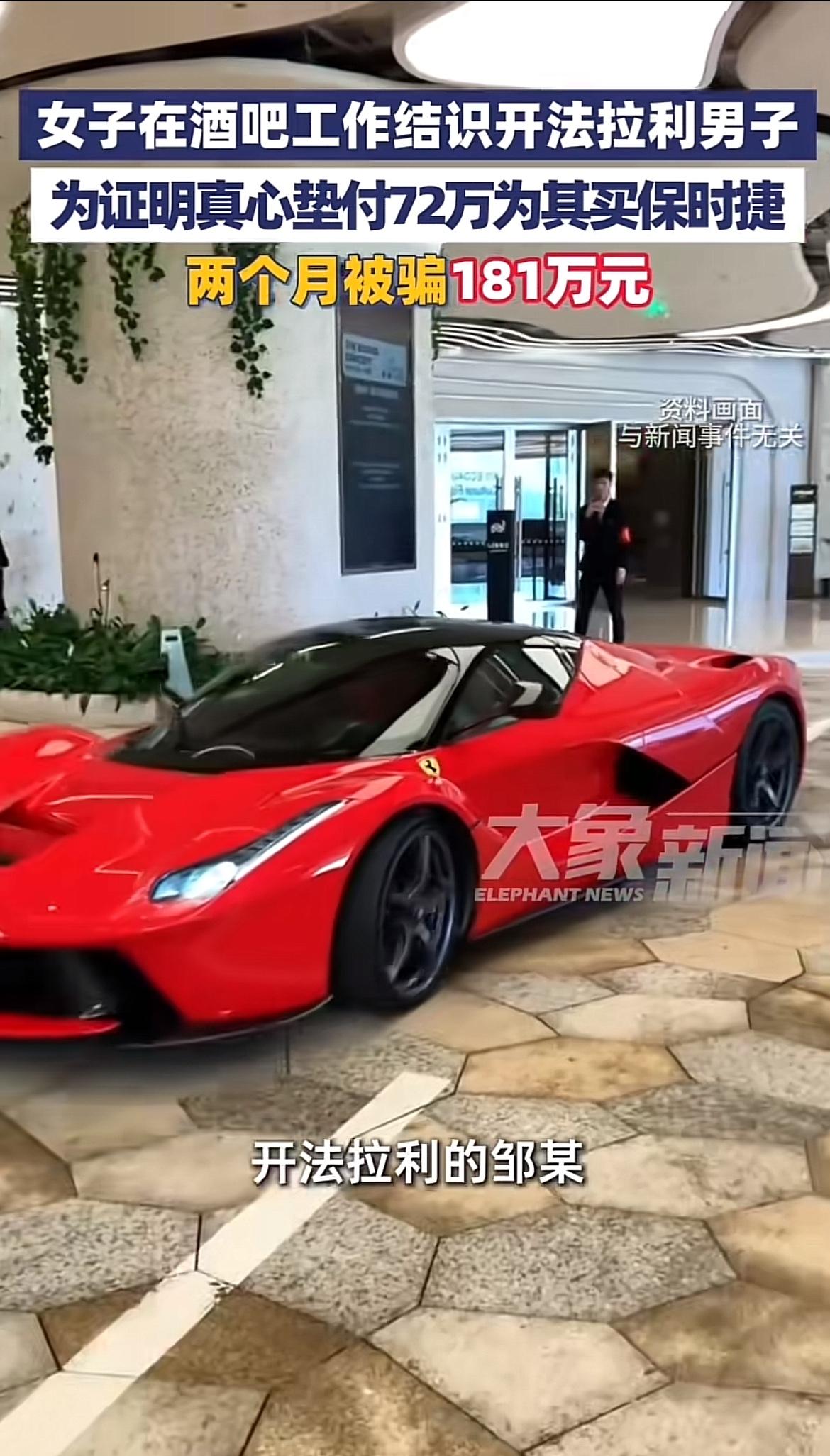 现在的骗子手段真是防不胜防。江苏的张女士在酒吧工作,结识了开法拉利、自称酒吧老板的邹某。两人恋爱后,邹某各种理由借钱,什么银行卡冻结、酒吧发不出工资、撞人要赔偿。更离谱的是以买车证明真心,让张女士垫付72万买保时捷,转手就卖了私吞73万差价。两个月张女士就被骗181万,等邹某失联才反应过来。 好在警方给力,多方协作抓住了邹某,他还在多省骗了其他女性。法院判了他11年,还得退赔130万。姐妹们恋爱时一定要擦亮眼睛,别被这种“甜蜜骗局”忽悠了。
