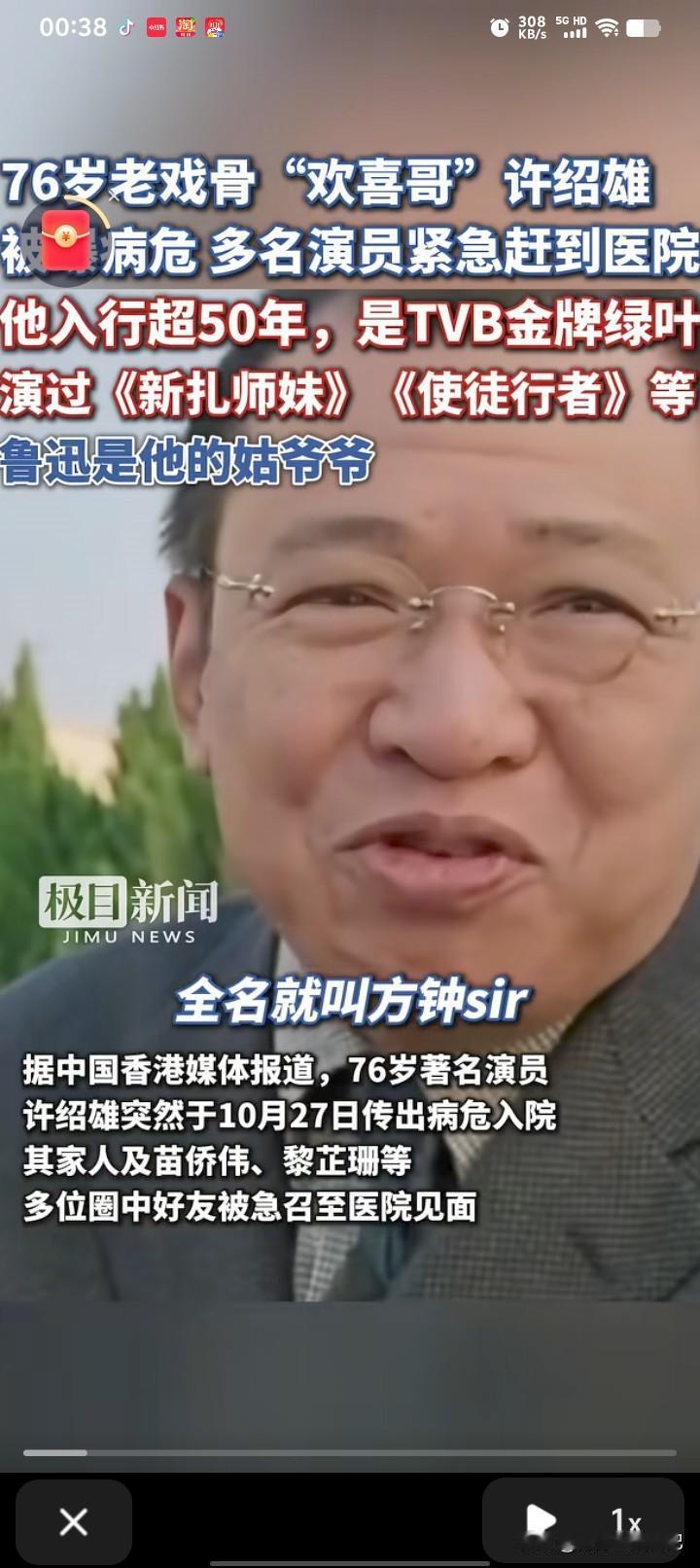 我们所熟知的影星们一个个走了:吴孟达,周海媚,李玟……我们也老了。 刚刷到许绍雄病危入院的消息, 心里咯噔一下,这可是陪着我们长大的“欢喜哥”啊! 从吴孟达到周海媚, 老港星一个个离开, 本就够唏嘘了, 这下连76岁的他也出事, 真让人揪心。 谁能想到,这个TVB一期艺员, 演了半辈子配角的大叔, 竟是名门之后——太公是清末尚书, 姑婆还是鲁迅夫人许广平 。 可他从没靠家世, 硬是凭《使徒行者》里亦正亦邪的欢喜哥、《暗战》里的警界老油条, 把“绿叶”演成了经典。 现在苗侨伟、 佘诗曼等近20位艺人都去探望了, 佘诗曼说起他还落了泪 。 我忽然觉得, 我们怀念的不只是他们的演技, 更是那种把职业当信仰的认真, 是港剧黄金时代最鲜活的印记。 真心盼着欢喜哥挺过来!你们记忆里他最经典的角色是哪个?快来聊聊~