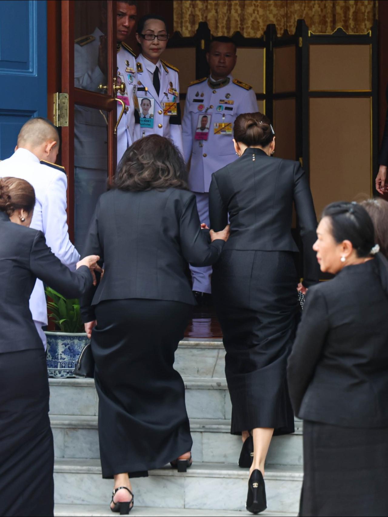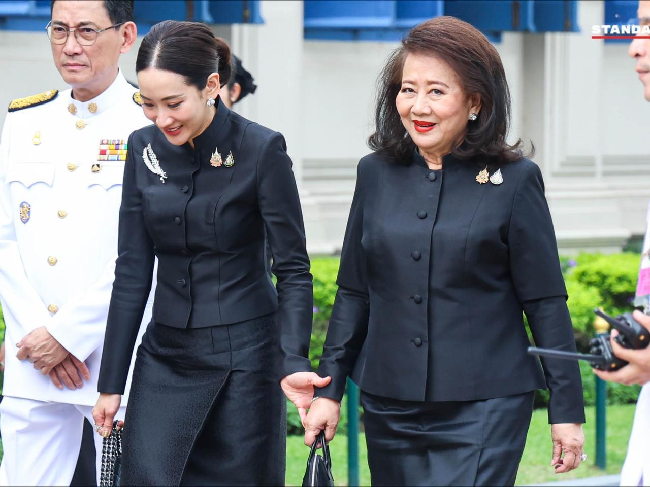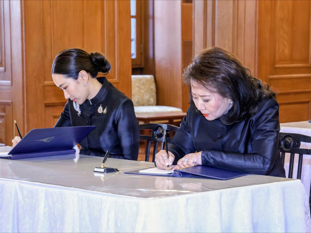 萍通塔带着母亲,一同悼念诗丽吉太后 10月27日,泰国王室事务局首次开放大皇宫内萨哈泰·萨玛空亭后,萍通塔与母亲前来吊唁并签署吊唁簿。母女俩皆身着黑丧服,神情庄重,对着太后照片缓缓行屈膝礼,以表哀思。