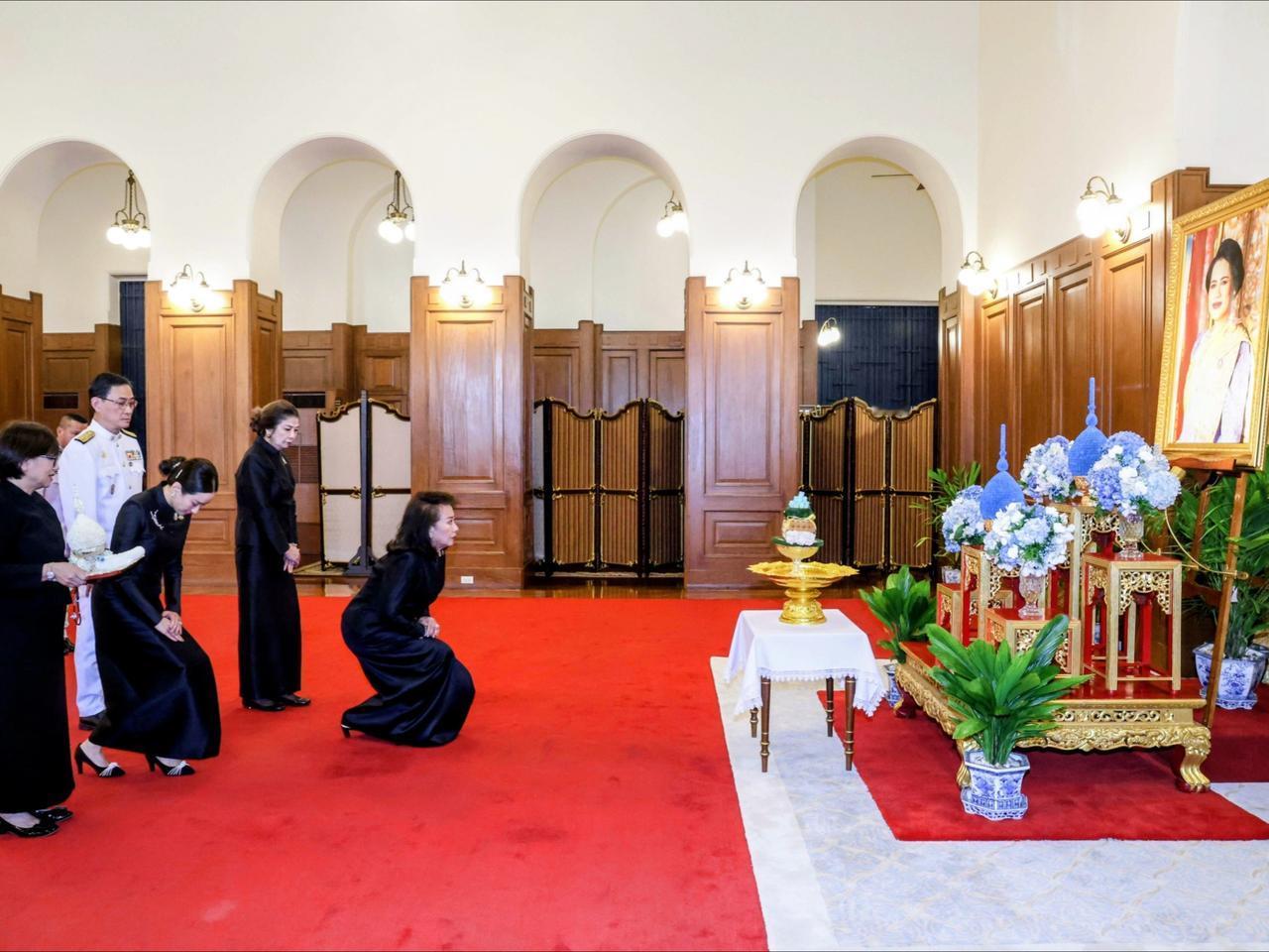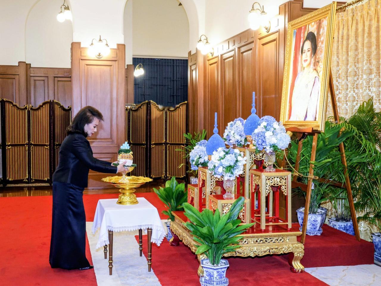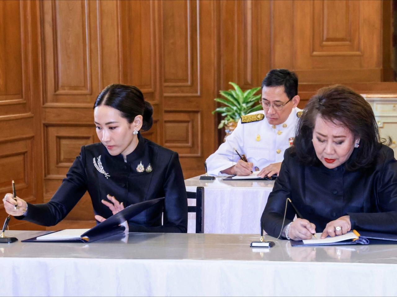 萍通塔带着母亲,一同悼念诗丽吉太后 10月27日,泰国王室事务局首次开放大皇宫内萨哈泰·萨玛空亭后,萍通塔与母亲前来吊唁并签署吊唁簿。母女俩皆身着黑丧服,神情庄重,对着太后照片缓缓行屈膝礼,以表哀思。