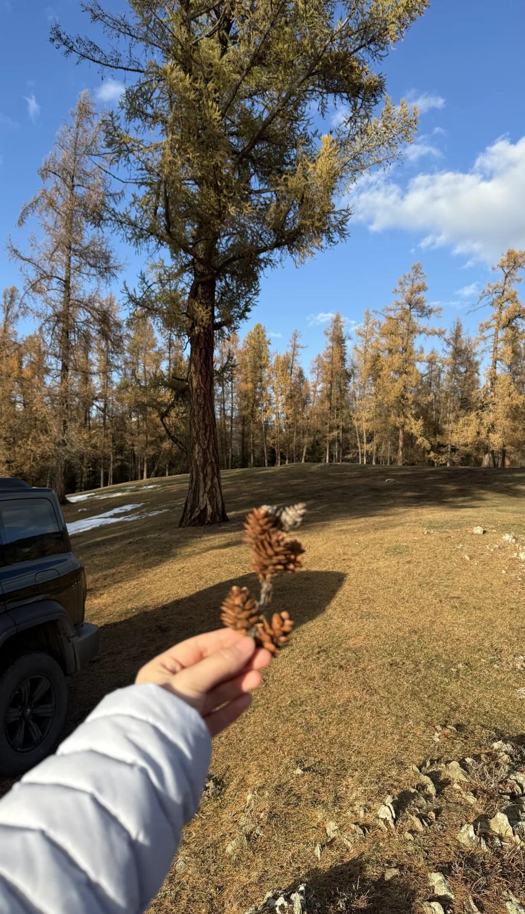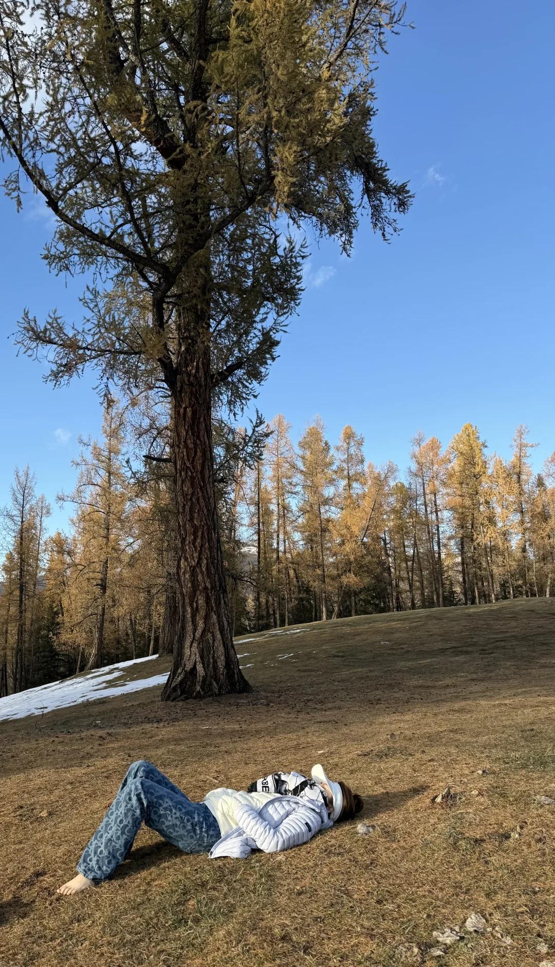 新疆不自驾游你会后悔的 其实真正特别美的景色都是在路上 自己开车想在哪里停就在哪里停 去好几个景点反而很失望 门票也不便宜 那天我们把车开到草坡上 躺着感受最后的秋意 很安静只能听到风声跟鸟鸣 太阳下山便开始降温了 🐿️🌲 自驾游旅游 新疆