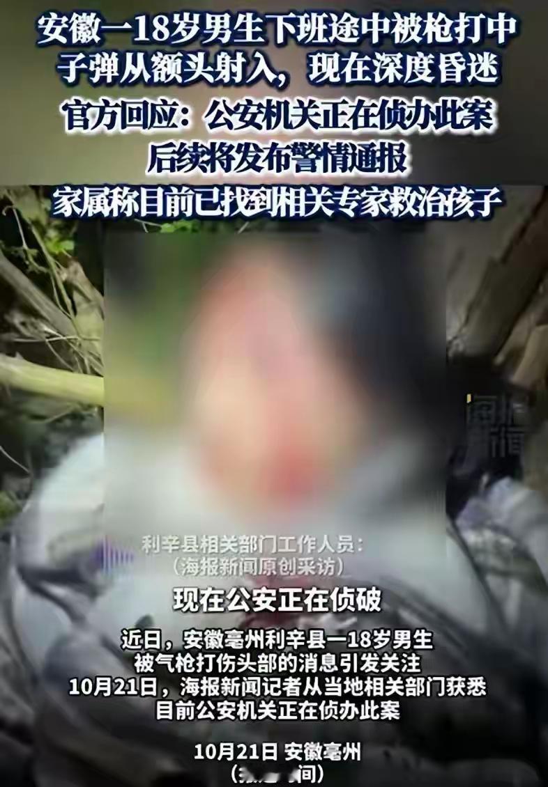 【午夜枪声!安徽18岁少年下班路上额头中弹,谁该为流弹负责?】 这事儿真让人后背发凉。10月19日凌晨1点,亳州利辛县刚下夜班的18岁小伙,骑着车突然就感觉额头一热——愣是挨了一枪子儿。小伙子捂着伤口跌跌撞撞找人帮忙,血顺着指缝往下滴,最后被紧急送医取出子弹。目前警方已经把子弹送检,具体是哪来的枪、谁开的火,还在查。 好端端走在大街上,怎么就能中弹?子弹总不会凭空冒出来。民间持枪在我们国家管得有多严大家都清楚,可这枚真实的子弹却结结实实嵌进了一个普通打工人的额头。这可不是拍电影,是活生生的现实!年轻人下班路上遭遇这种无妄之灾,说句实在的,谁听了不冒冷汗? 我们得琢磨了:这颗子弹究竟从哪儿飞来的?是有人非法持枪走火,还是另有隐情?涉枪案件背后往往牵扯复杂的社会安全问题。今天子弹打中的是这位18岁青年,明天会不会有其他人遭遇类似危险?治安管理能不能堵上这种要命的漏洞? 再说这小伙子才刚成年,深夜一点才下班,可见打工不容易。这一枪下去,身体受苦不说,心理阴影短时间都难消除。年轻人拼生活已经够难了,还得防着“天外飞弹”,这事儿搁谁身上受得了? 目前案件还在调查,子弹来源一天不查清,老百姓心里就一天不踏实。希望警方尽快揪出责任人,该追责的追责,该堵的漏洞赶紧堵上。社会治安是底线,可开不得半点玩笑。 各位读者你们怎么看?欢迎在评论区讨论。枪击悲剧 被子弹打中胸口