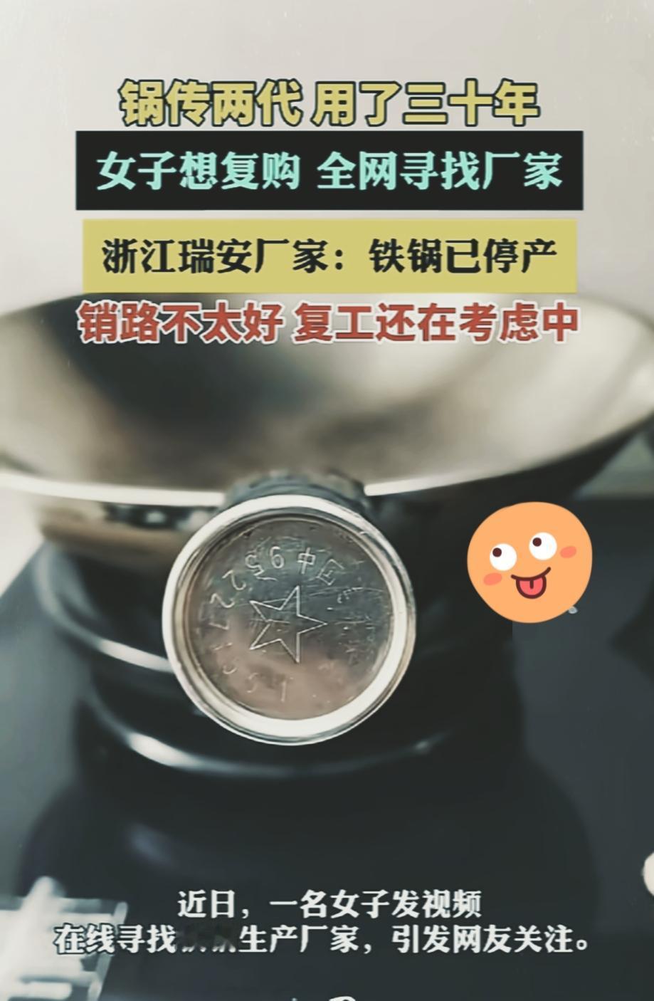 破天的富贵临到了瑞安五星铁锅 一锅传两代,还不粘锅不生锈 网友急喊,快复工上链接,这年头,能用二三十年的锅不生锈不粘,估计也就老辈人传下来的老铁锅了。 近日,有一女子发了一段视频,说家里有一个锅用了二三十年了,依然不生锈不粘,想上全网找这个锅的厂家。 没想到,这视频一出,引来了成千上万网友的围观和点赞,纷纷表示想要一个这样的锅。这个视频找到了当年的厂家。没想到,厂家说已经很多年没有生产这个锅了,因为这个锅的销量不好,现在也不知道是否还要复工。 也有网友调侃说,虽然不知道这么高质量的锅为什么会销量不好,但你若恢复生产,我一定珍惜机会蹲着去买,这破天的富贵就来了。 如果复工,那这口锅你们会买吗?